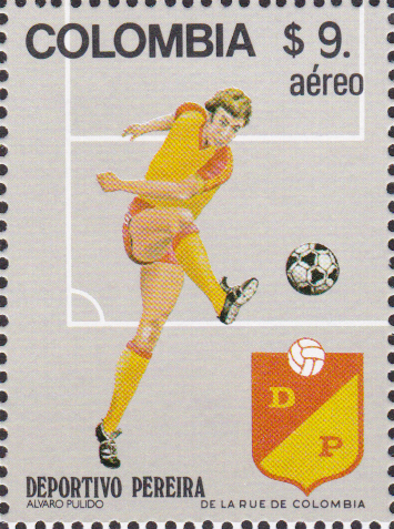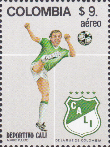 Zu den Fußballweltmeisterschaftenn1982 in Spanien ist in Kolumbien diese Marke (MiNr 1564) mit einem Spieler und dem Wappen von Deportivo Cali erschienen.
