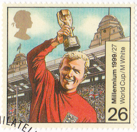 Eine Marke aus Großbritannien (MiNr 1626) zeigt eine Spielszene mit Bobby Moore.