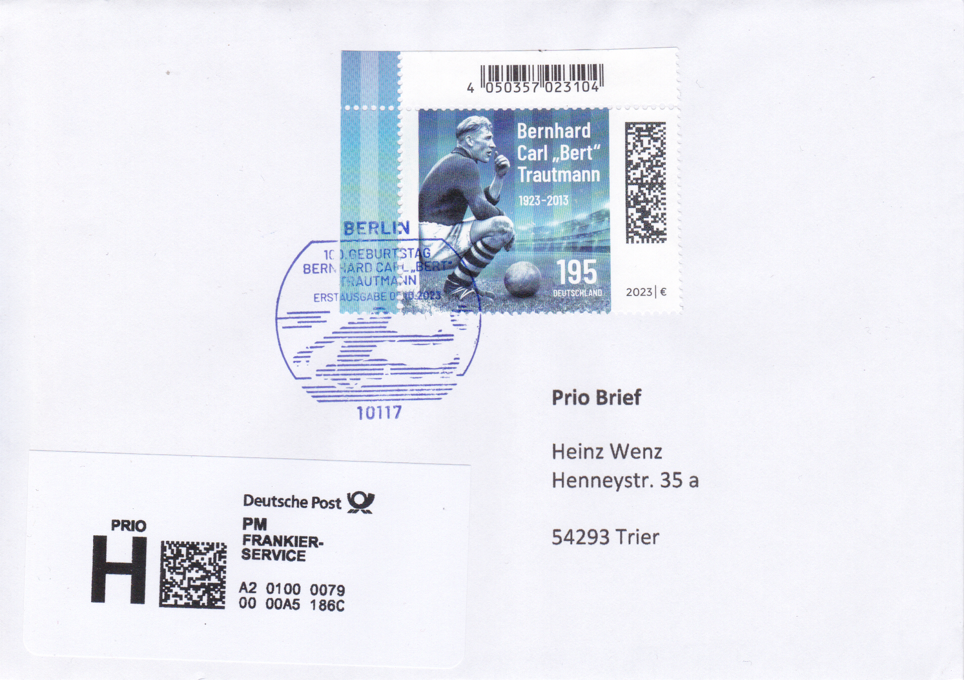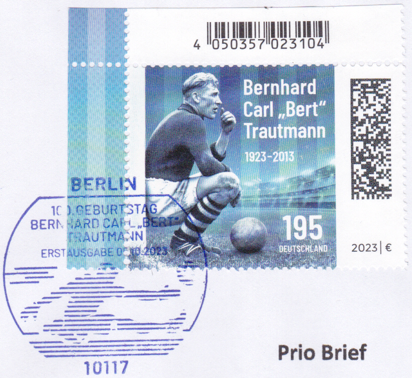 Zu seinem 100. Geburtstag erschien bei der Deutschen Post diese Marke (MiNr 3787) mit Bert Trautmann in Hocke an Torpfosten lehnend. Hier zeige ich ein Eckrandstück mit EAN-Codierung.