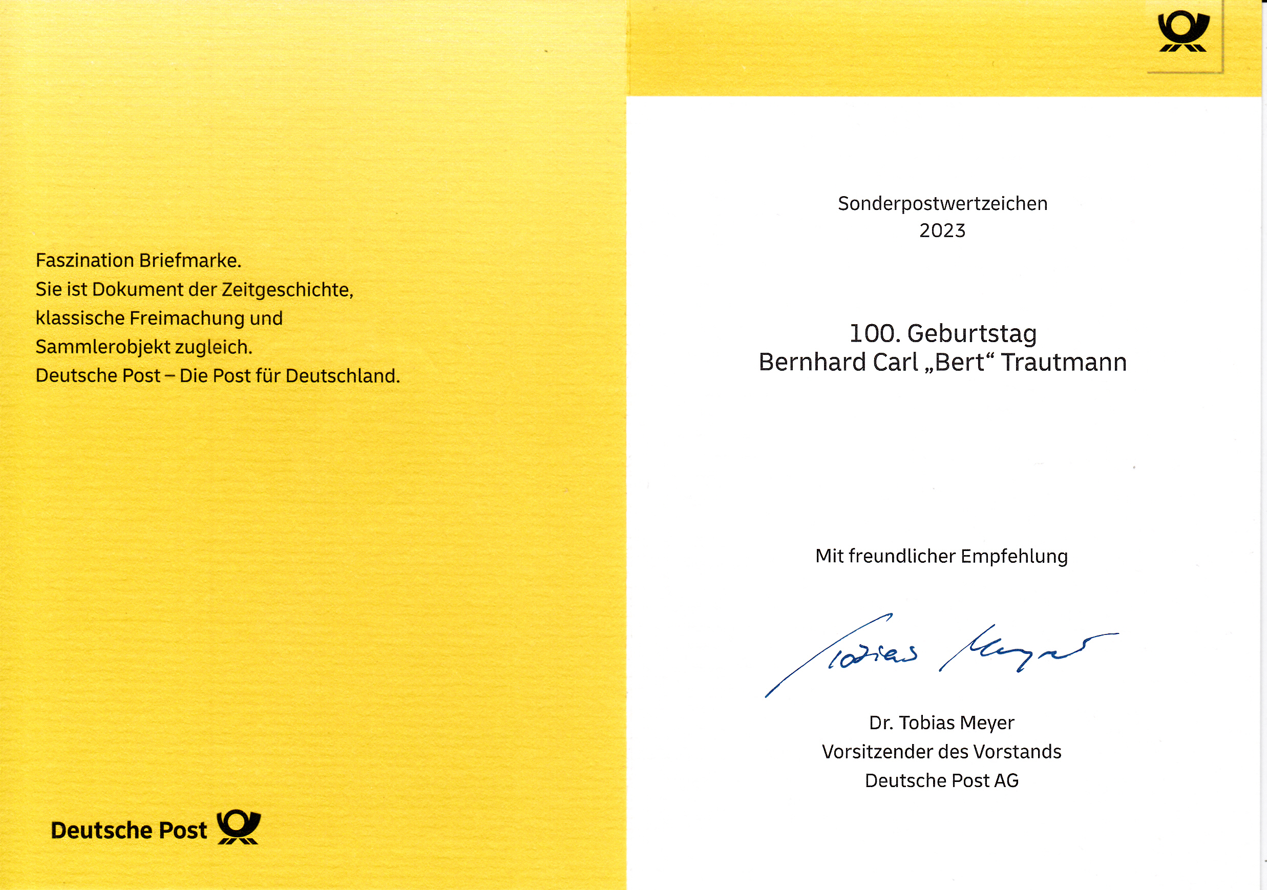 Klappkarte des Vorstandsvorsitzenden der Deutschen Post AG mit einer Marke (MiNr 3787) zum 100. Geburtstag von Bernhard Carl Trautmann (1923-2013; deutscher Fußballspieler) und dem Ersttagsonderstempel Bonn.