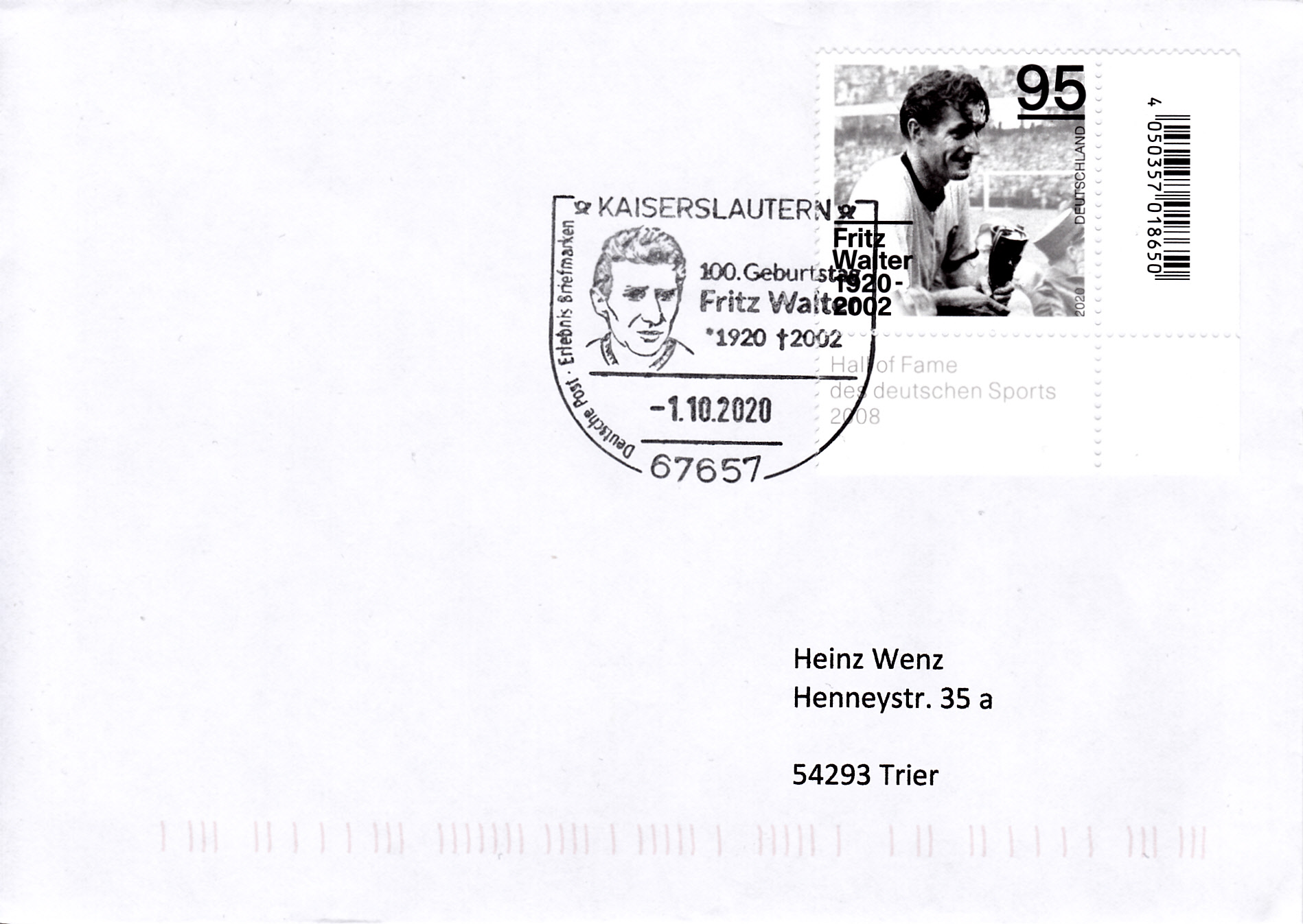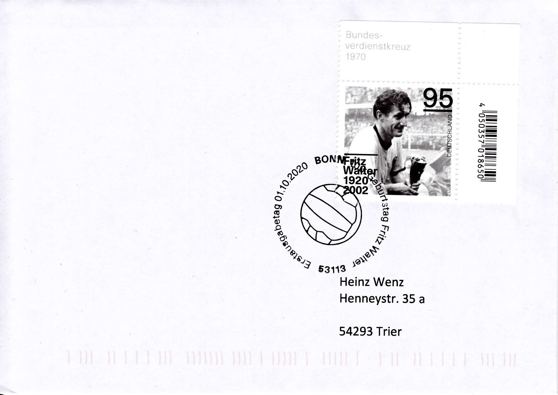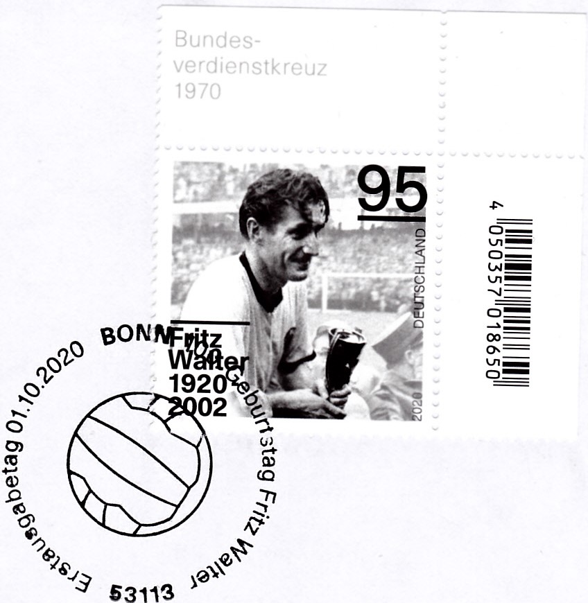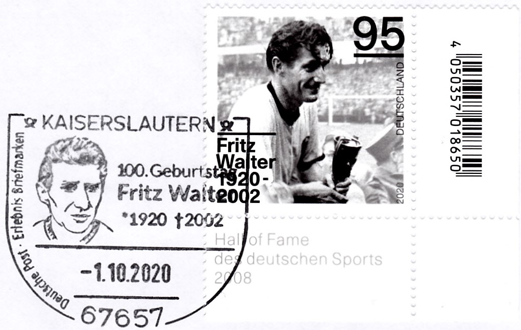 Bei der Deutschen Post erschien zu seinem 100. Geburtstag von Fritz Walter eine Marke (MiNr 3568) mit Fritz Walter mit WM-Pokal 1954 im Stadion.