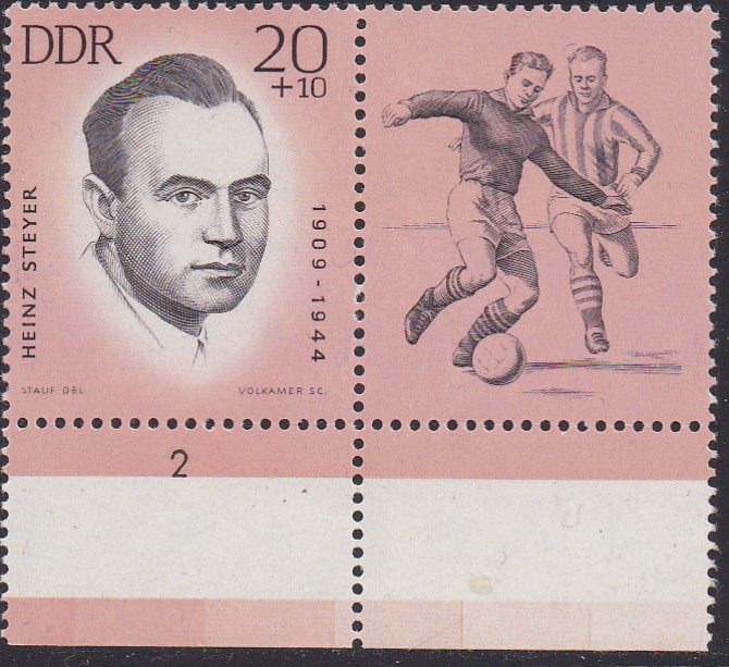 Auf dieser Marke aus der DDR (MiNr 961) wird sein Porträt gezeigt und auf dem anhängenden Zierfeld sind zwei Fußballspieler zu sehen.
