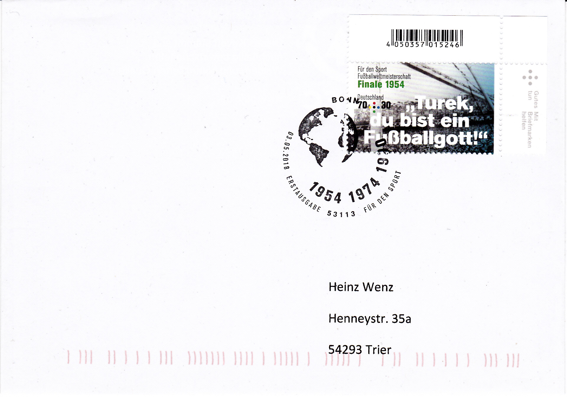 Die Marke zu 70+30 Cent der Serie "Für den Sport 2018" (MiNr 3380) werden die Wort von Zimmermann zitiert. Hier ein Eckrandstück mit EAN-Code dieser Marke.