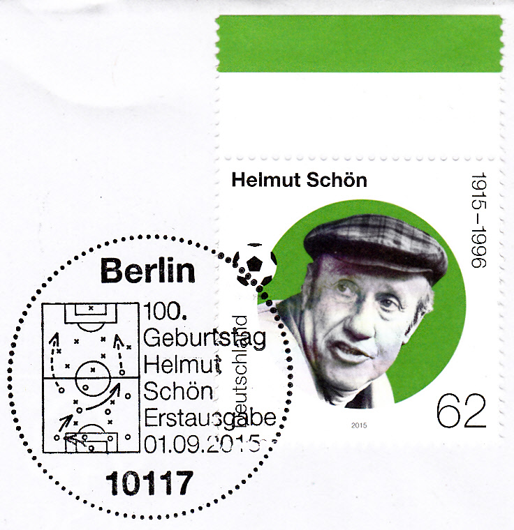 Zur Briefmarkenmesse in Berlin gibt es einen Sonderumschlag mit dem Wertzeicheneindruck der Marke MiNr 3174) zum 100. Geburtstag von Helmut Schön. Auf dem Zudruck wird Helmut Schön mit dem Weltmeisterpokal 1974 gezeigt.