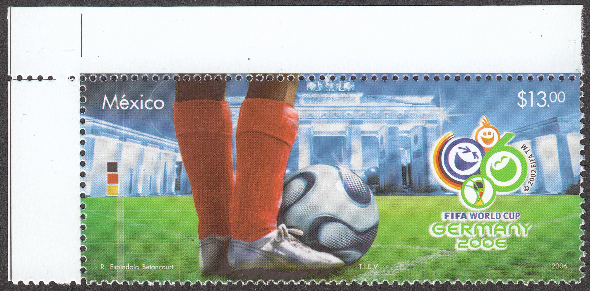 Diese zur WM 2006 erschienene Briefmarke aus Mexico, MiNr. 3259, zeigt "+ Teamgeist", den offiziellen Fußball der WM 2006: