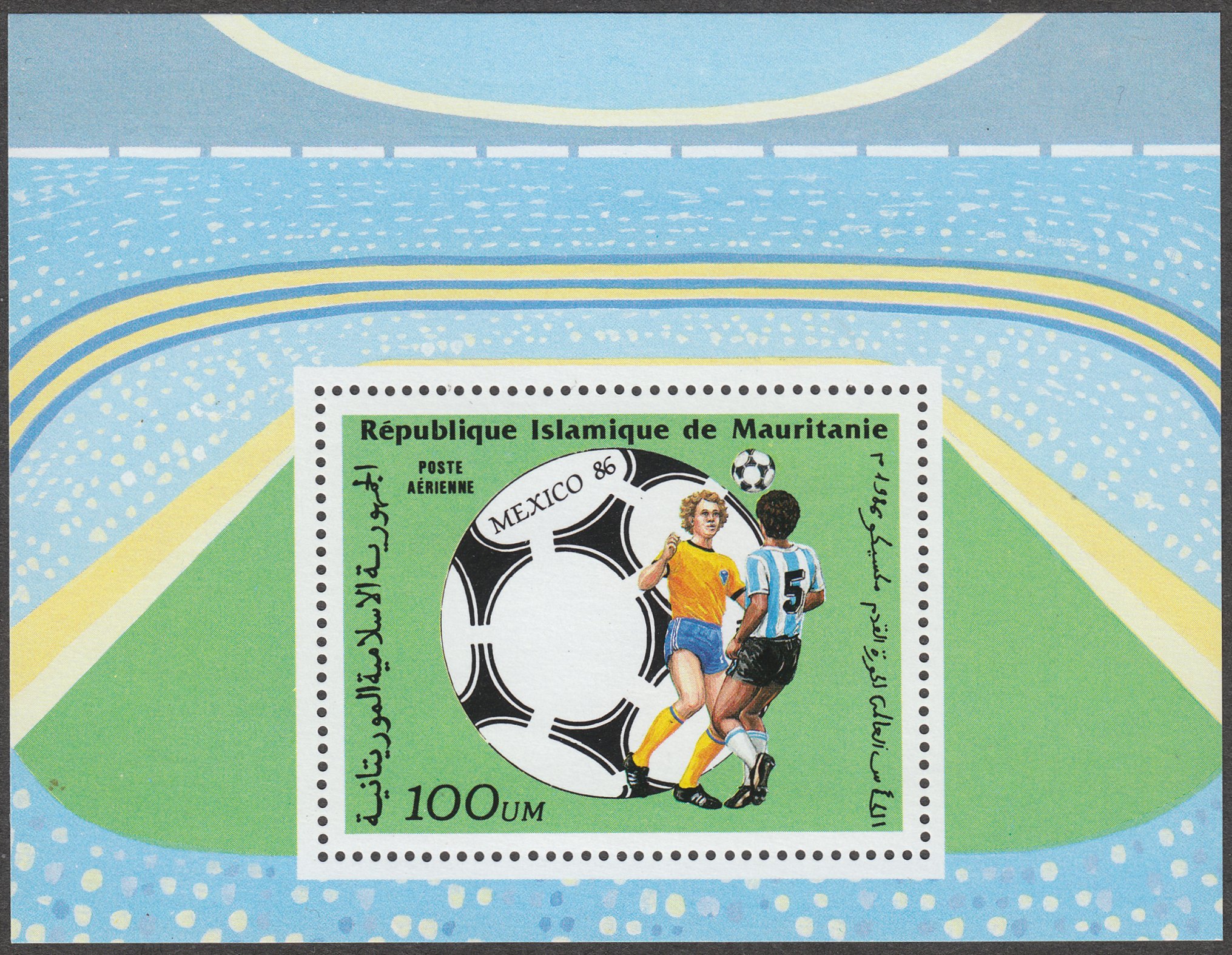 Auf diesem zur WM 1986 Mexico in Mauretanien erschienenen Block wurde nicht etwa der offizielle Weltmeisterschaftsball Tango azteca abgebildet, sondern der Tango Espana, der offizielle Ball der WM 1982 in Spanien: