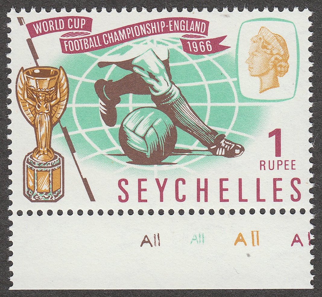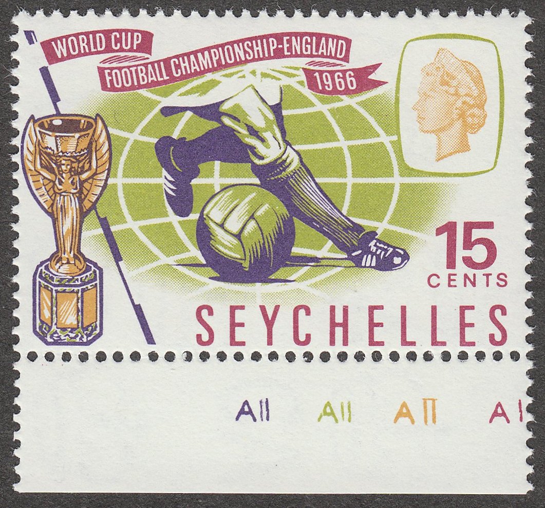 Diese zur WM 1966 erschienene Ausgabe der Seychellen zeigt einen solchen Fußball stilisiert, wobei die Darstellung der Mittelnaht des Originalballs vergessen wurde: