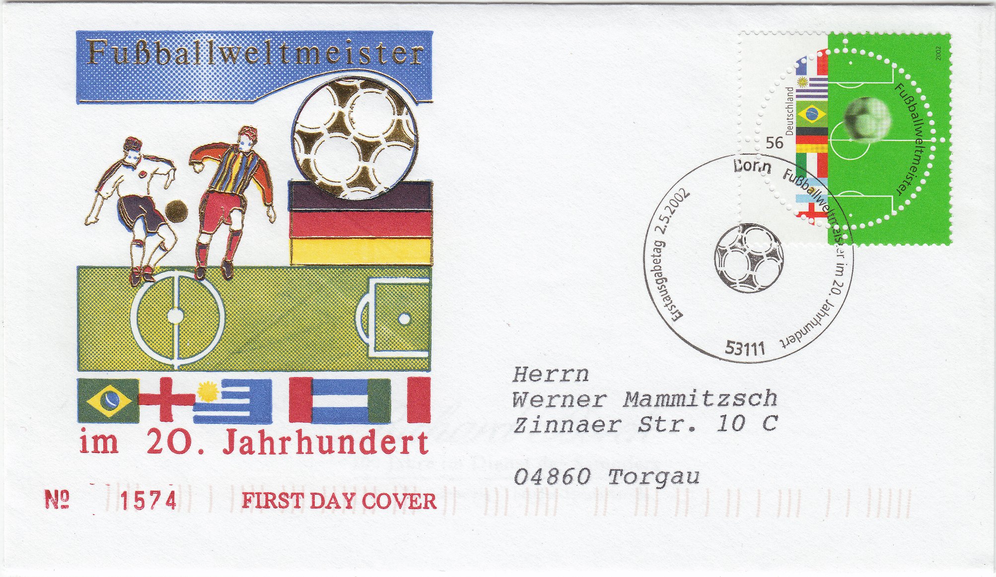 Dieser Beleg zeigt auf der 2002 in Deutschland erschienenen Briefmarke sowie dem ESST Bonn einen Fußball des Typs "Tango", wie er bei den letzten Fußballweltmeisterschaften im 20. Jahrhundert ab 1978 eingesetzt wurde: