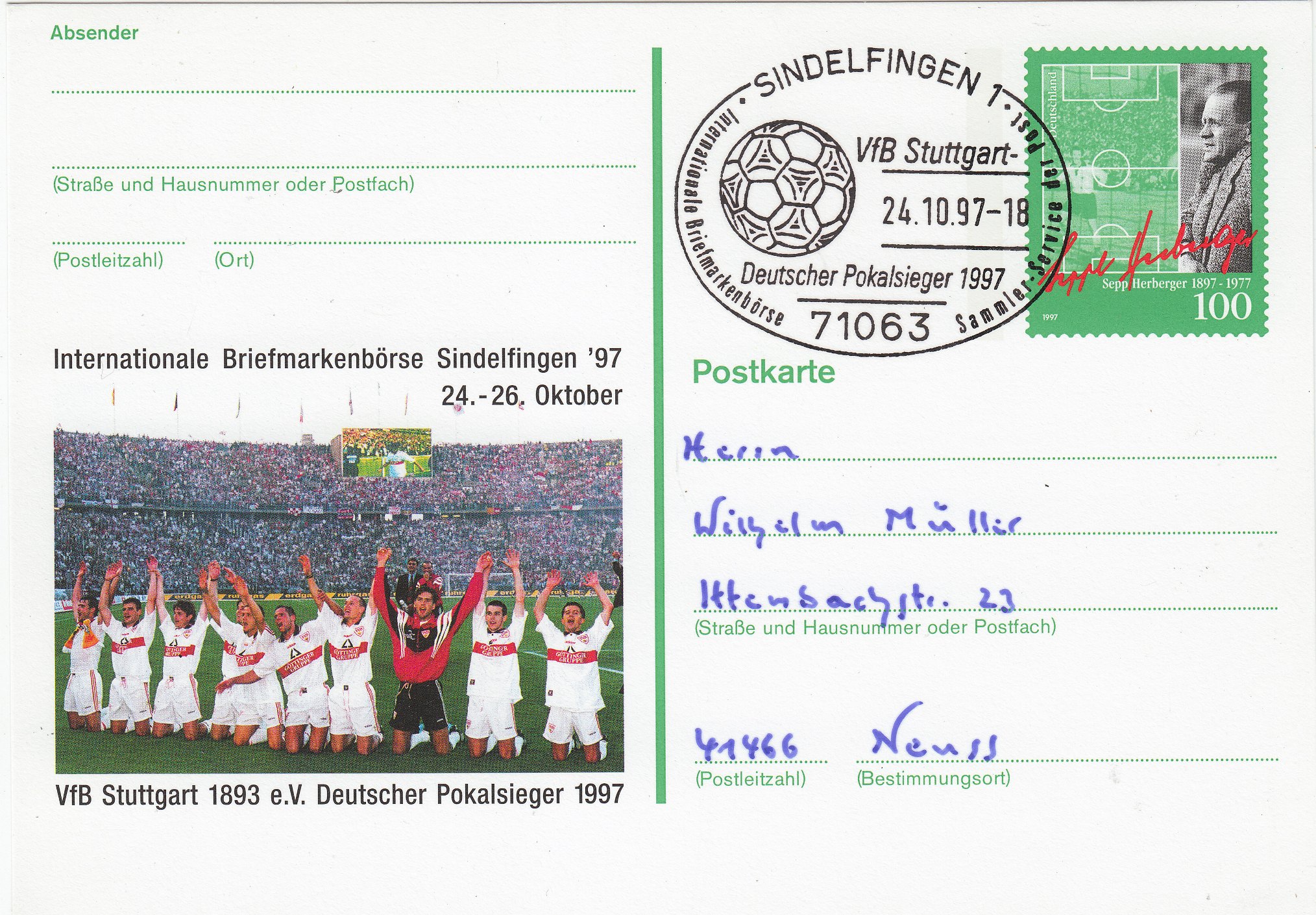 Als Motiv für diesen zum Erfolg des VfB Stuttgart als Deutscher Pokalsieger 1997 aufgelegten Stempel wurde ein Fußball des Typs "Tango" gewählt, wobei man bei diesem Exemplar neben der Farbgebung auch die Sechsecke und Fünfecke deutlich erkennt, aus denen ein solcher Fußball zusammengesetzt wird: