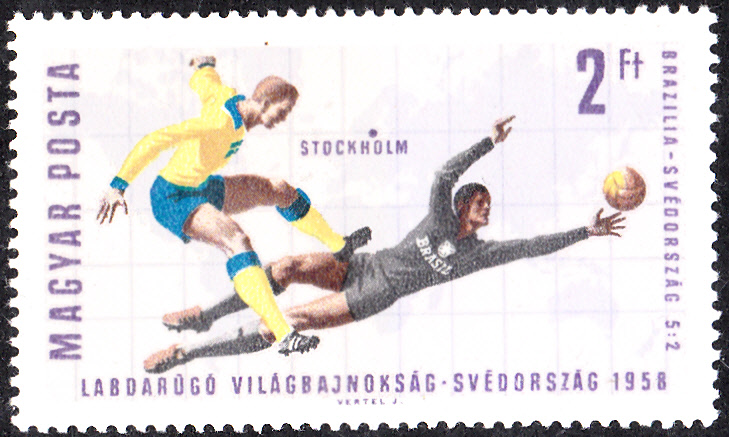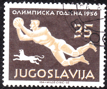 Diese Marke aus Dahomey (MiNr 214) zu den Sportspielen von Dakar 1963 zeigt einen Torwart bei einer Parade.