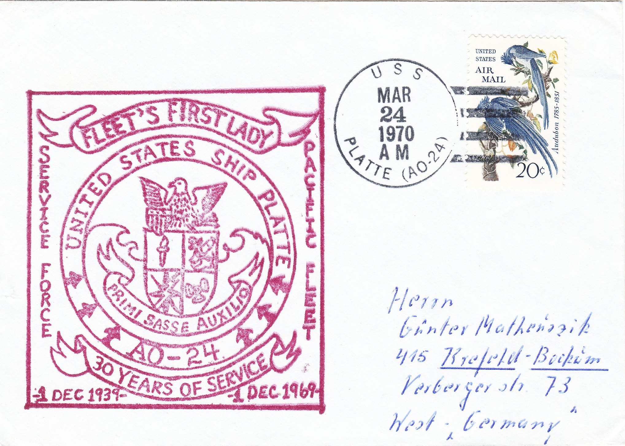 Dieser Beleg dokumentiert mit einem entsprechenden Cachetstempel das 30 jährige Jubiläum des am 01.12.1939 in Dienst gestellten Schiffes: