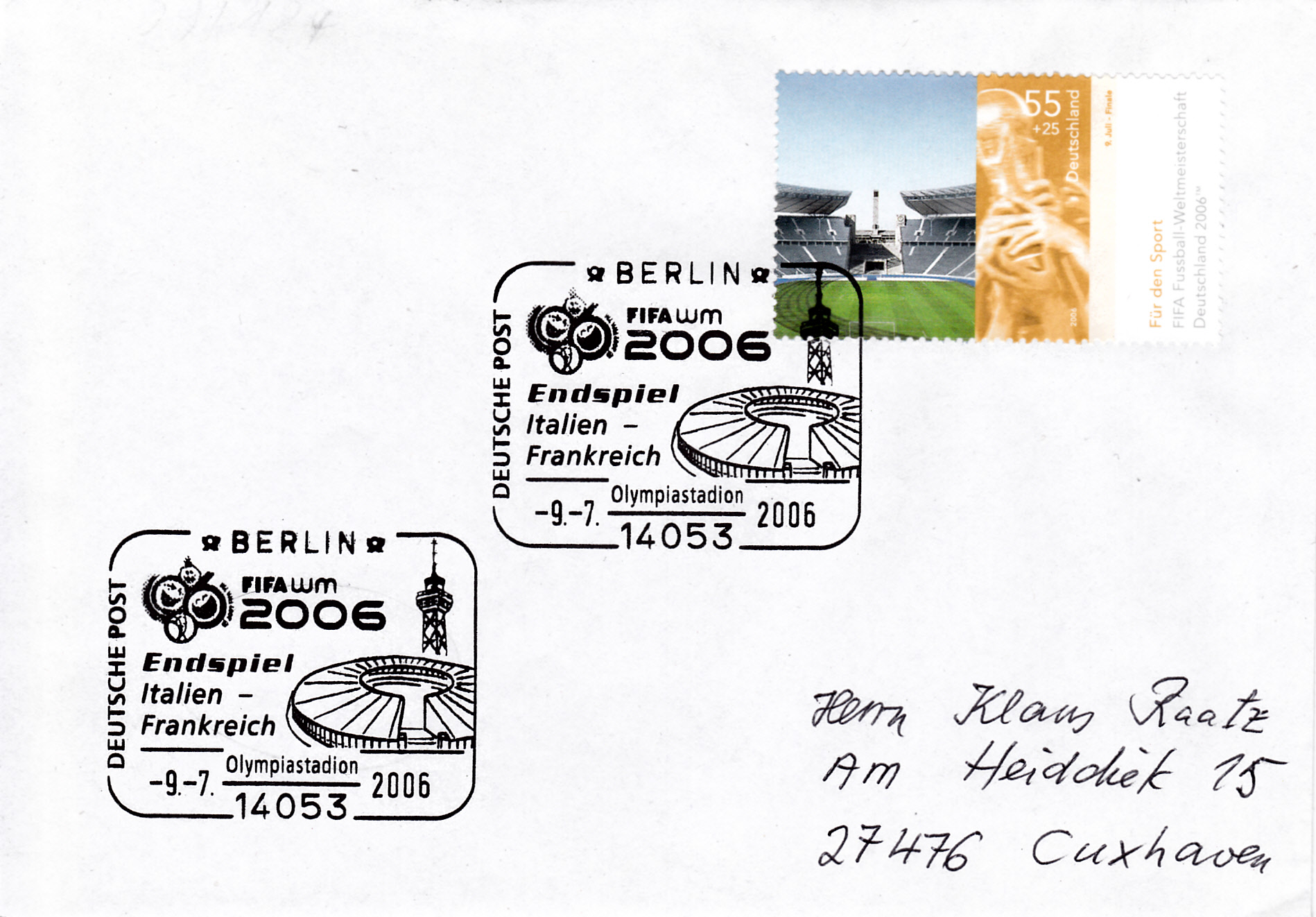 Sonderstempel vom 9.7.2006 aus Berlin zum Endspiel der Fußball-WM Italien - Frankreich. Im Stempelbild wird das Olympiastadion in Berlin gezeigt. Die zur Frankatur verwendete Marken Marke (MiNr 2519) mit dem Blick in das Berliner Olympiastadion passt hervorragend zum Stempel.