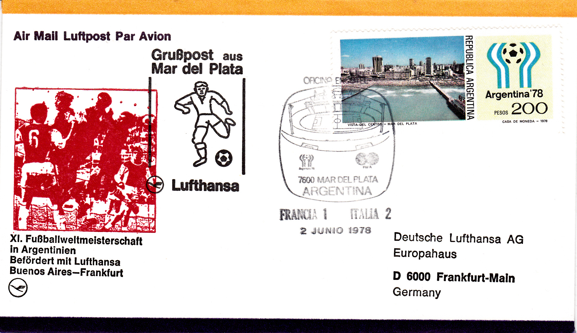 Dieser Beleg zum Spiel Frankreich - Italien 1:2 bei der Fußball-WM 1978 wurde mit einem Sonderstempel entwertet, der dieses Stadion zeigt.