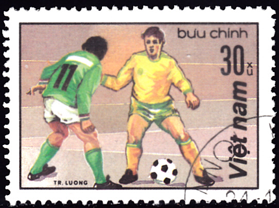 Eine weitere Marke der Serie aus Vietnam (MiNr 1415) zeigt einen Sprint eines Spielers mit dem Ball und den Abwehrversuch eines Gegenspielers.
