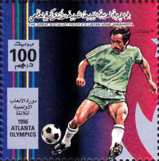 Diese Marke aus Libyen (MiNr 2263) zu den Sommerspielen in Atlanta zeigt einen Fußballspieler bei der Ballannahme.