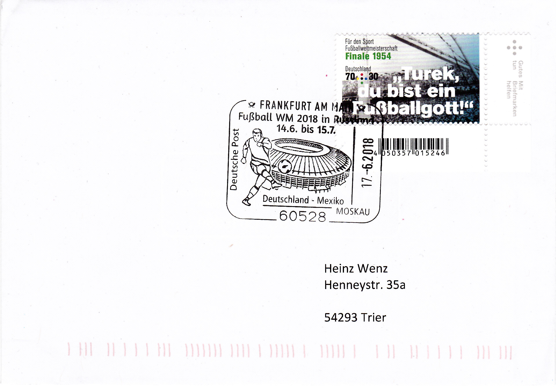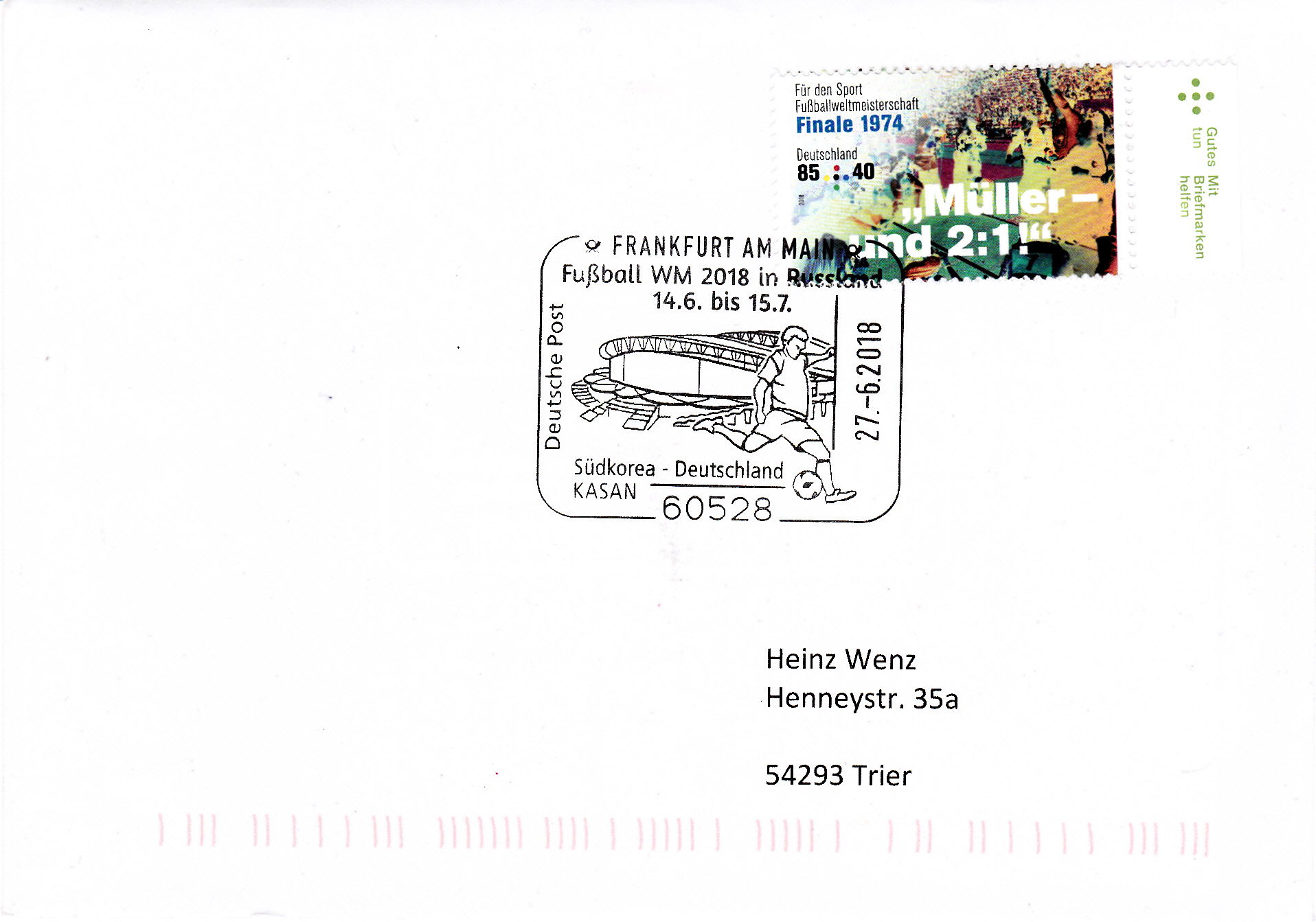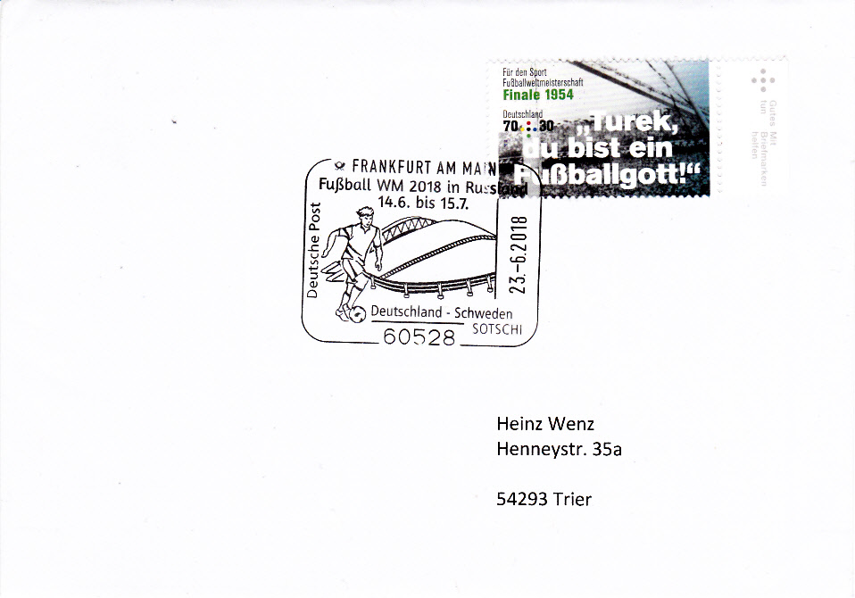 Die auf Seite 5 hier gezeigte Marke aus Rumänien (MiNr 2315) mit einer Spielszene beim Fußball aus der Markenserie zu den Olympischen Sommerspielen 1964 gibt es auch in einer anderen Farbe und einer anderen Wertstufe (2,00 Lei statt 1,35 Lei) als geschnittene Marke (MiNr 2323).