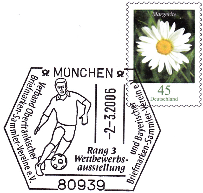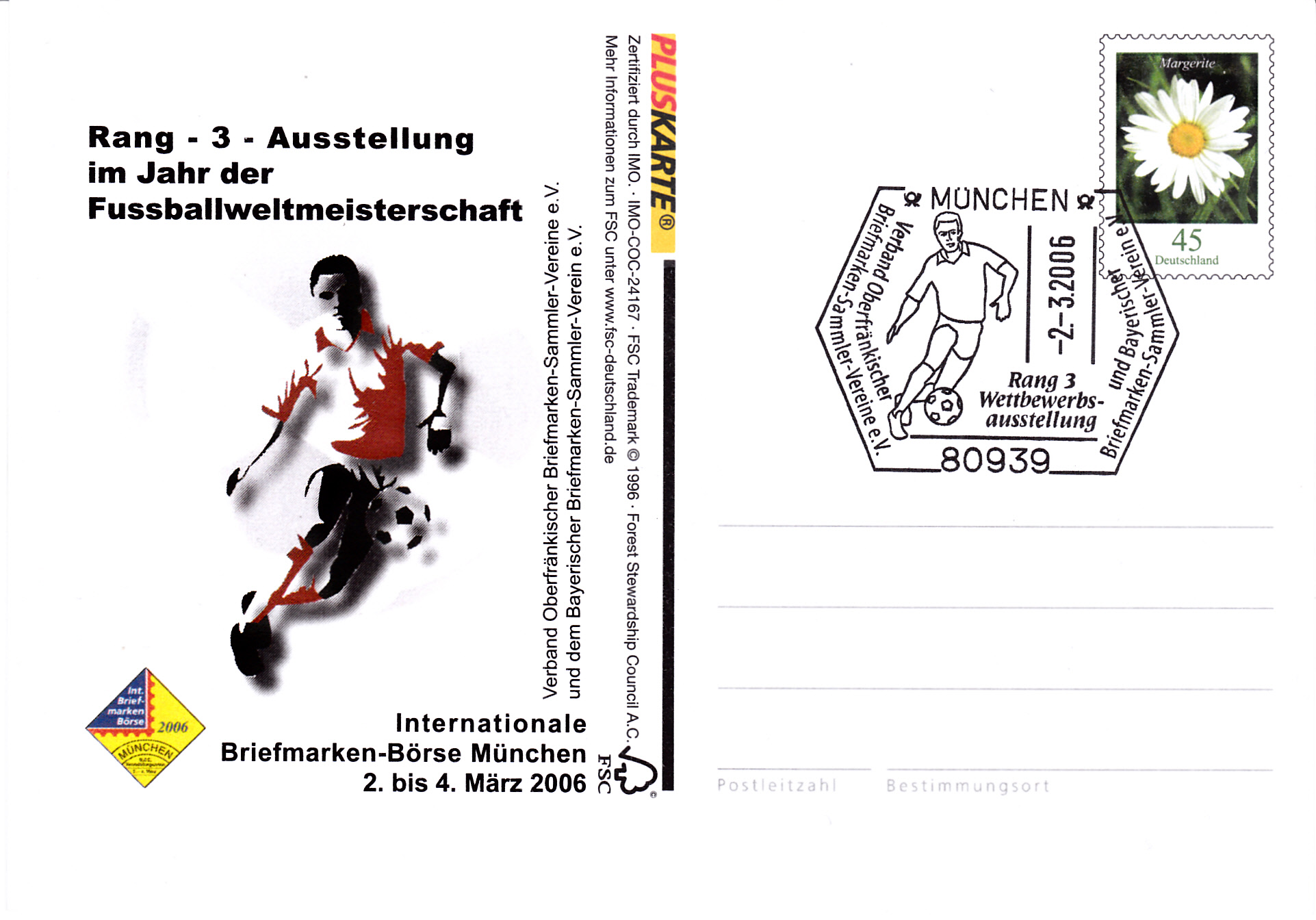 Sonderstempel aus München vom 22.3.2006 mit einem ballführenden Fußballspieler im Stempelbild auf einer Ganzsachen-Postkarte (MiNr P 165 II) mit Zudruck zu einer Rang-3-Ausstekkung bei der Briefmarkenbörse in München.