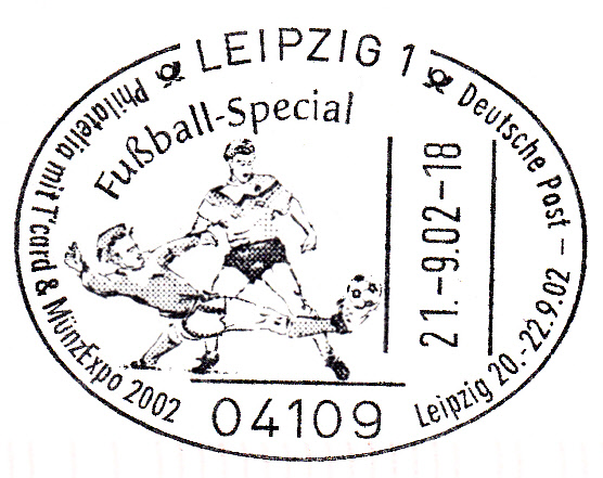 Der Sonderstempel zur Philatelia 2002 in Leipzig vom 21.9.2002 zeigt einen Zweikampf um den Ball.