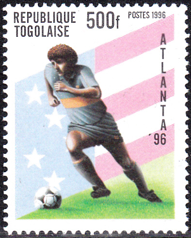 In der Serie aus Togo zu den Olympischen Spielen 1996 in Atlanta gibt es auch eine Marke (MiNr 2387) mit einem Fußballspieler.