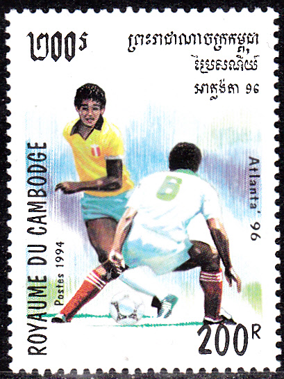 Diese Marke aus Kambodscha (MiNr 1423) aus der ersten Serie Kambodschas zu den Olympischen Spiele 1996 vom 20.3.1194 (!) zeigt eine Szene beim Fußball.