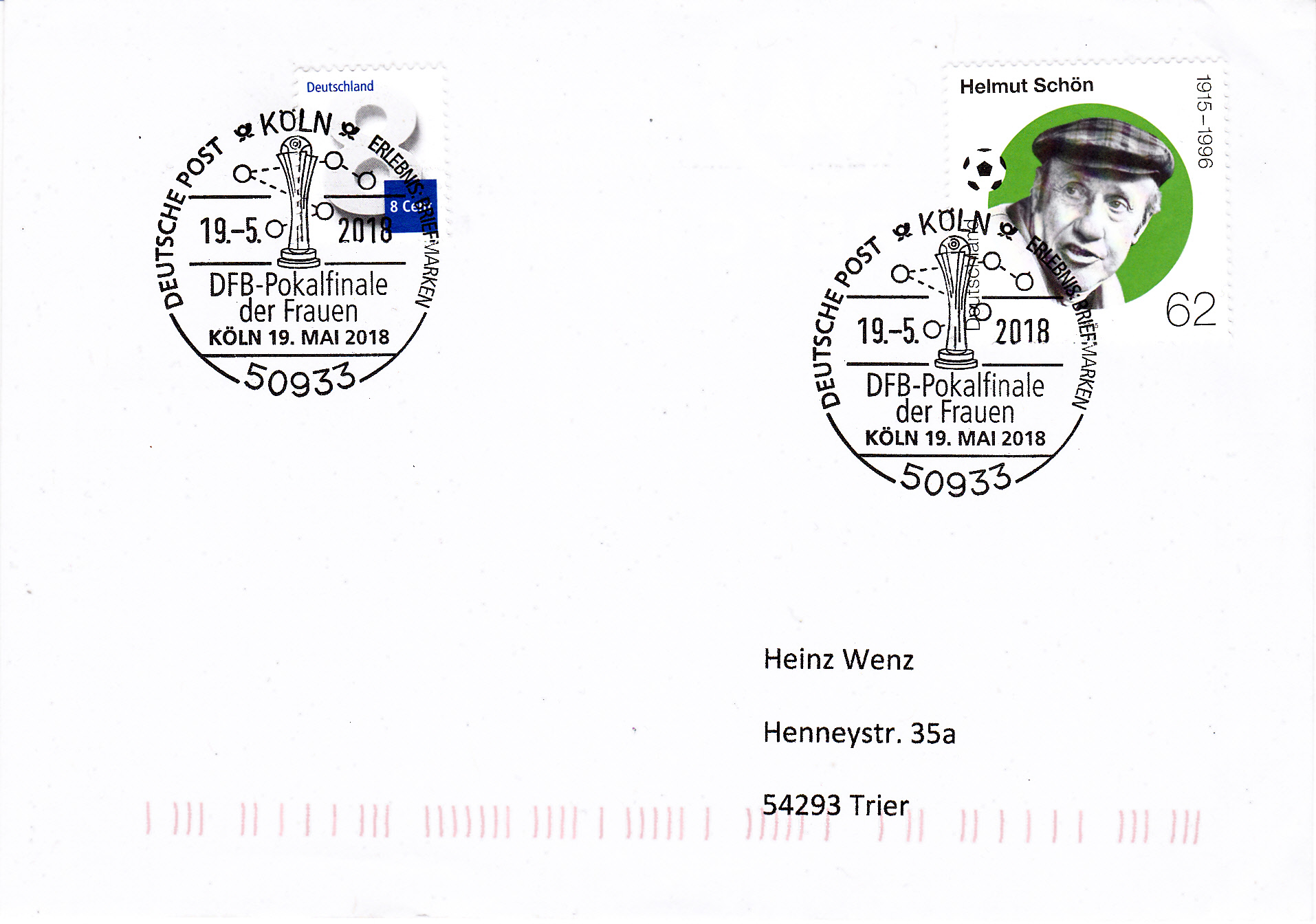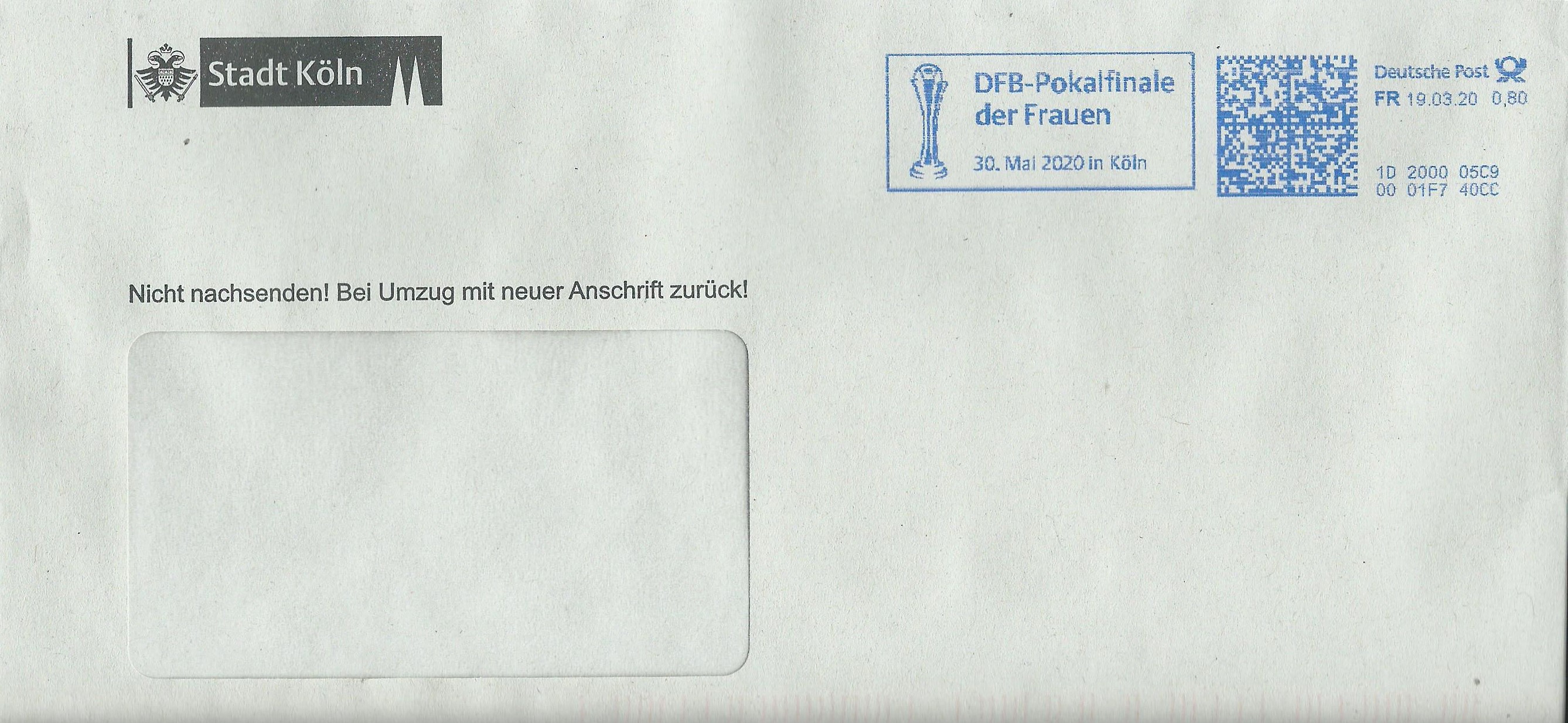 mir ist hier ein Beleg in die Hände gefallen, der mich doch etwas zum Nachdenken bewogen hat. Ein Freistempler der Stadt Köln vom 19.3.20 mit einem Werbeeinsatz „DFB-Pokalfinale der Frauen am 30. Mai 2020 in Köln“. Bekanntlich ist ja der gesamte Terminplan aller Sportveranstaltungen durch das Corona-Virus komplette Makulatur geworden. Die Fußball-Bundesliga pausiert (vielleicht bis Ende April oder noch länger?) und genauso auch die Pokal-Wettbewerbe. Ob der Termin für dieses Finale gehalten werden kann, man weiss es nicht. Dieser Umschlag passt aber auf jeden Fall in die Thematik DFB und man könnte ihn in einer Ausstellungssammlung sogar mit einer entsprechenden Beschreibung einfügen. Auf jeden Fall ein interessantes Sammelstück, auch wenn keine Briefmarke drauf klebt.