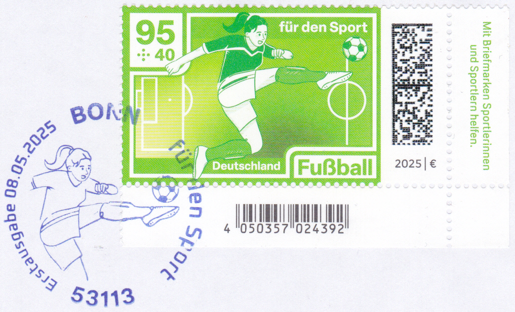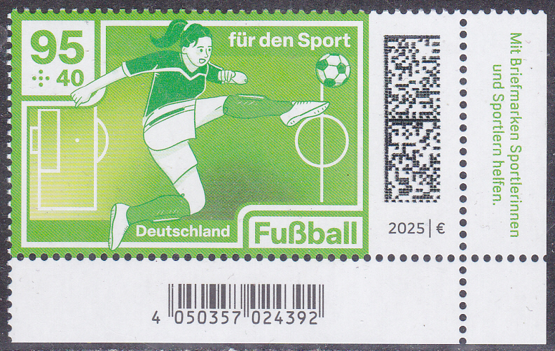 Die Marken der Deutschen Post für die Sporthilfe zeigen im Jahre 2025 Motive zum Thema "Ballsport". Auf der Marke zu 95+40 Cent (MiNr 3904) sehen wir eine Fußballspielerin vor einem Fußballfeld.