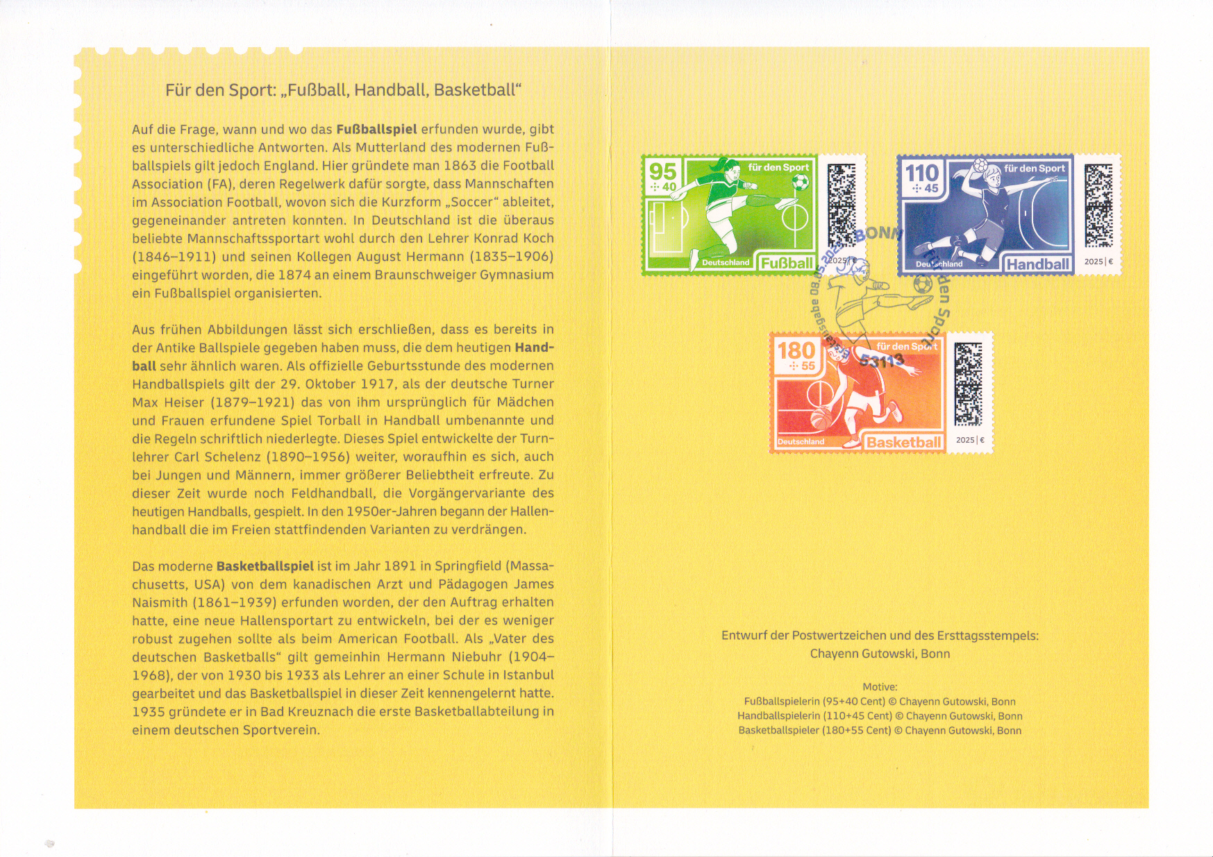 Klappkarte des Vorstandsvorsitzenden der Deutschen Post AG mit den drei Marken "Für den Sport" 2025 (MiNr 3904 bis 3906) mit Motiven zum Thema "Ballsport" und dem Ersttagsonderstempel Bonn.