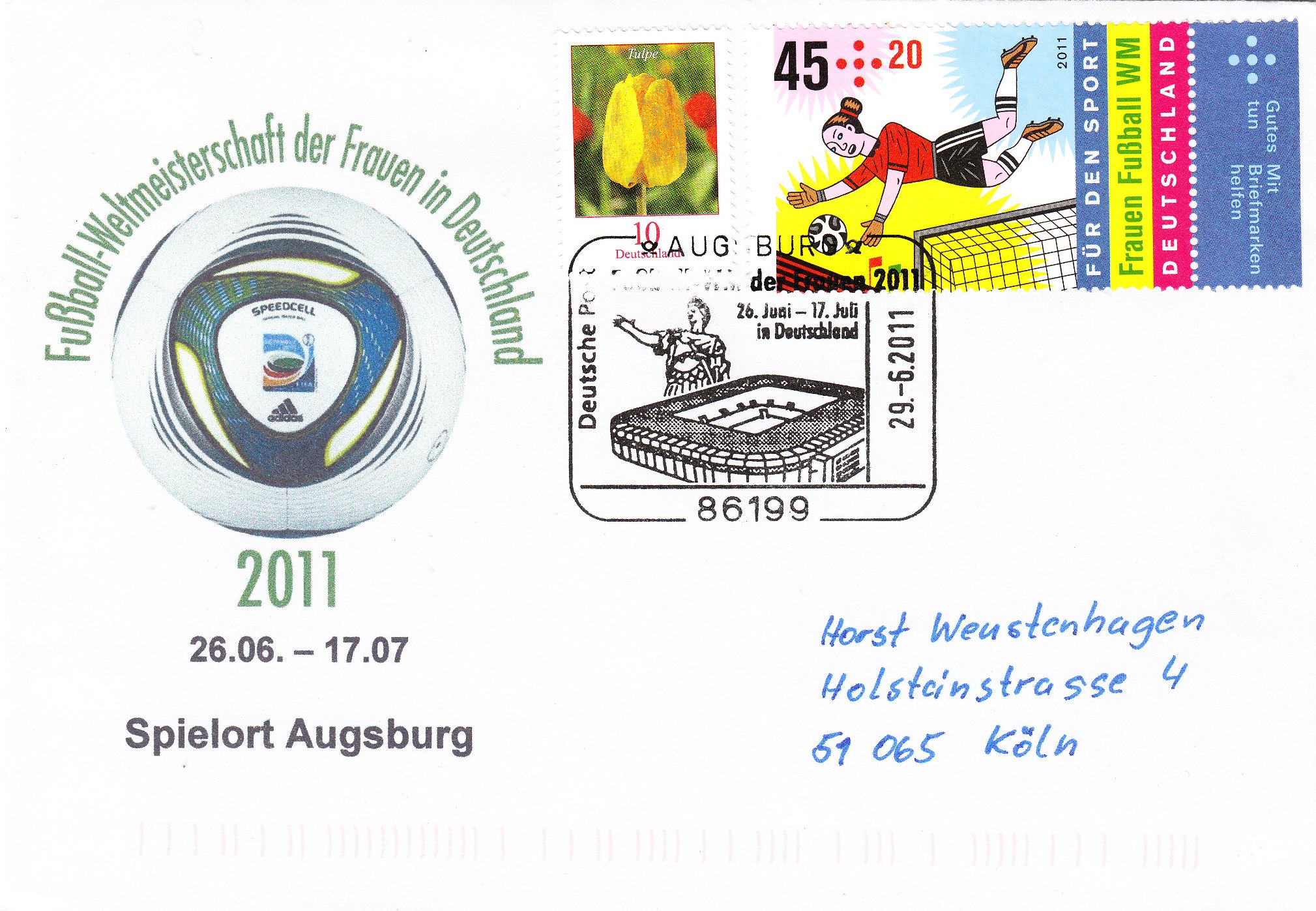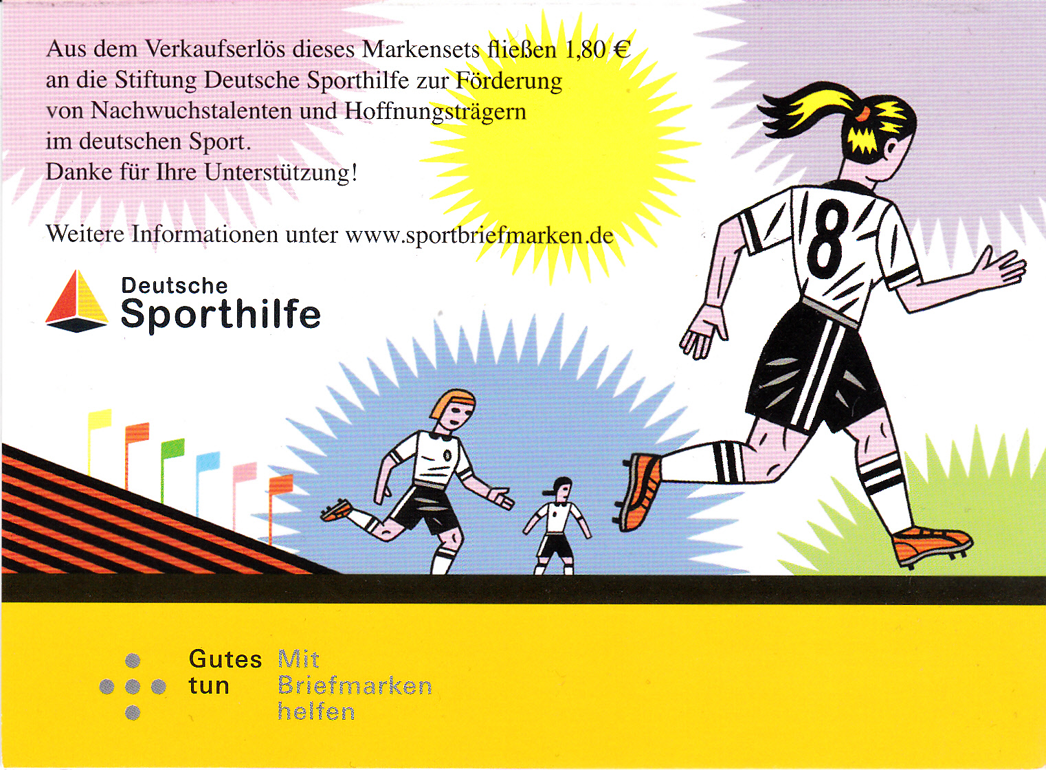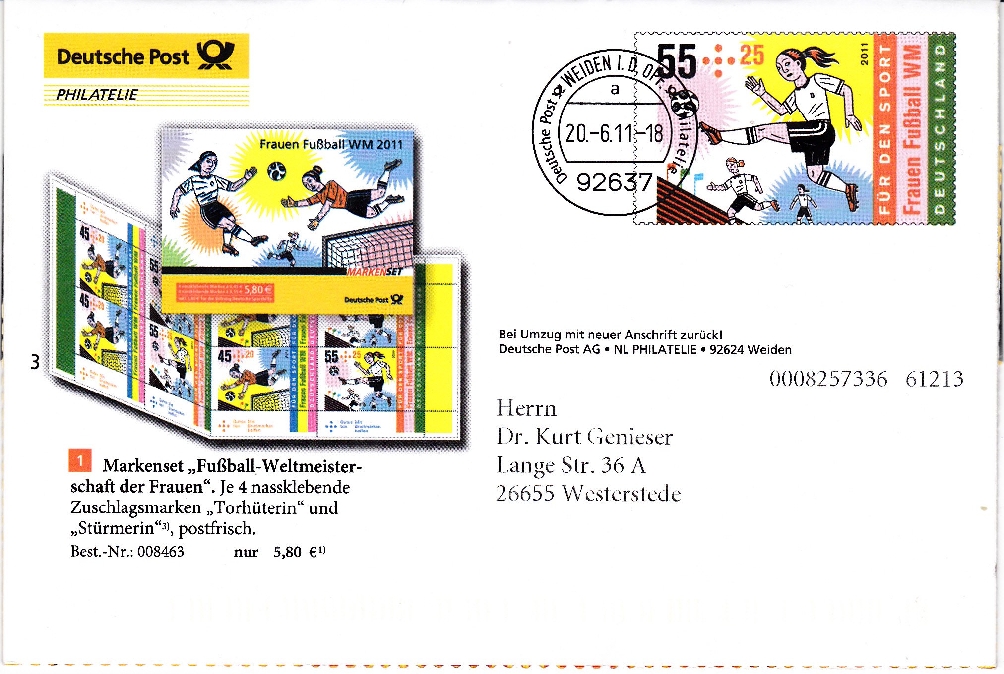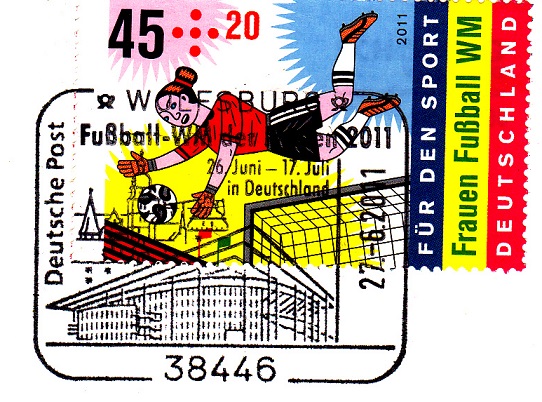 Die Deutsche Post AG NL Philatelie hat für eine Werbeaussendung die 55+25 Cent-Marke aus der Sportserie 2011 mit dem Motiv Frauen Fußball WM als Wertstempel mit Vorausentwertung das Falzblatt mit Werbung für das Markenset "Fußball-Weltmeisterschaft der Frauen" benutzt. Diese Ganzsache ist wird im Ganzsachenkatalog unter der MiNr EA F545 (EA = Eigenausgabe der DP AG, F = Postlogo "Deutsche Post / Philatelie") katalogisiert.