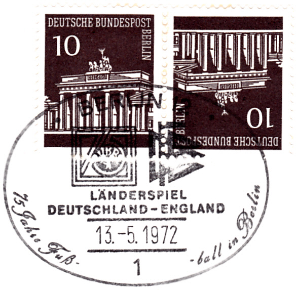 Im Sonderstempel vom 13.5.1972 aus Berlin zu diesem Spiel werden die Embleme des DFB und des VBB (Verband Berliner Ballspielvereine, gegründet 1897 als Verband Deutscher Ballspielvereine, kurz VDB, und 1902 in VBB umbenannt) gezeigt.