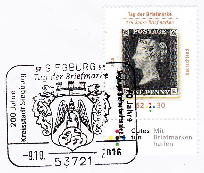 Sonderstempel zum Tag der Briefmarke vom 9.10.2016 aus Siegburg mit dem Preußischen Stadtwappen von Siegburg im Stempelbild. Der Brief ist mit 62 Cent unterfrankiert und wurde nicht mit Nachgebühr belegt.