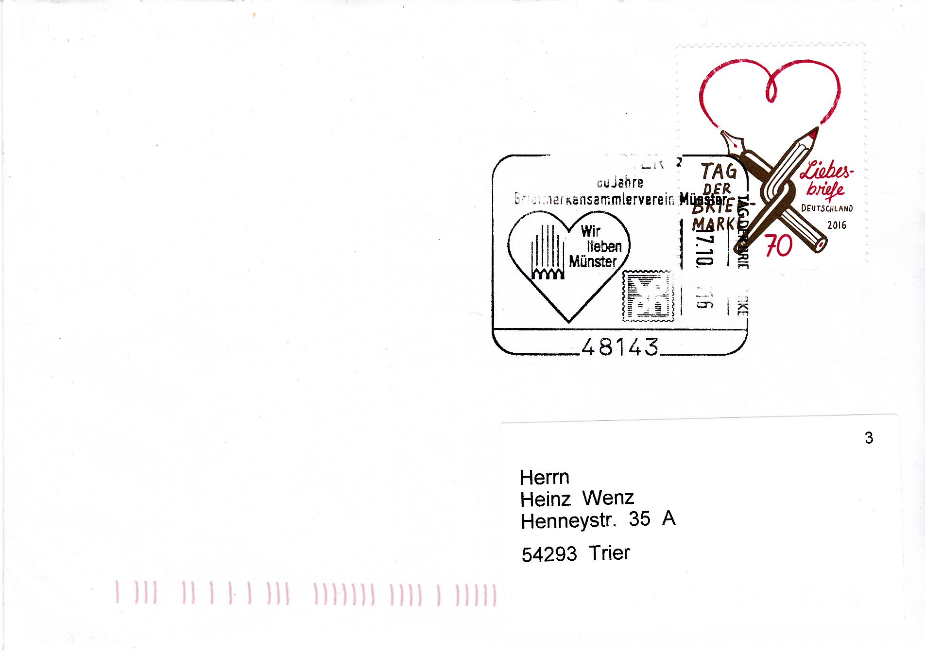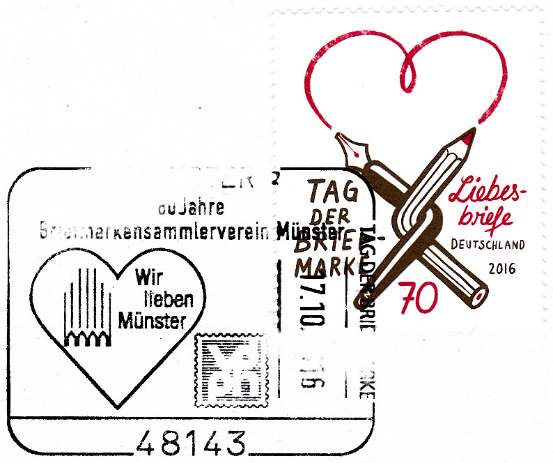 Sonderstempel zum Tag der Briefmarke vom 17.10.2016 aus Münster mit dem Logo "Wir lieben Münster" und dem Logo des Verbandes der Philatelisten in Nordrhein-Westfalen e.V. im Stempelbild. Leider ist dieser Stempelabschlag nicht "ganz gelungen".