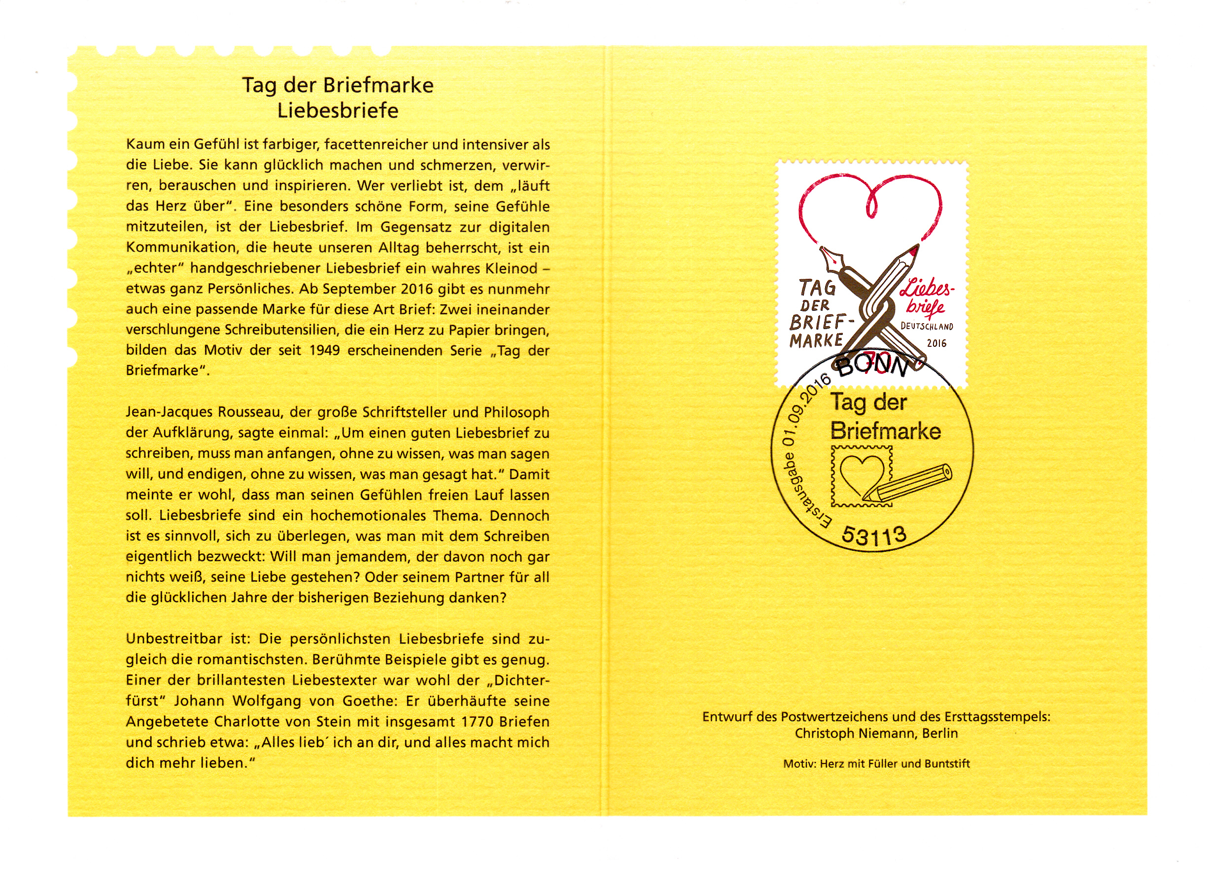 Zum Tag der Briefmarke 2016 erschien bei der Deutschern Post AG am 1.9.2016 eine Marke, MiNr. 3259, zum Thema "Liebesbriefe" mit dem Bild "Verschlungener Füllfederhalter mit Buntstift" und einem gezeichneten Herz.