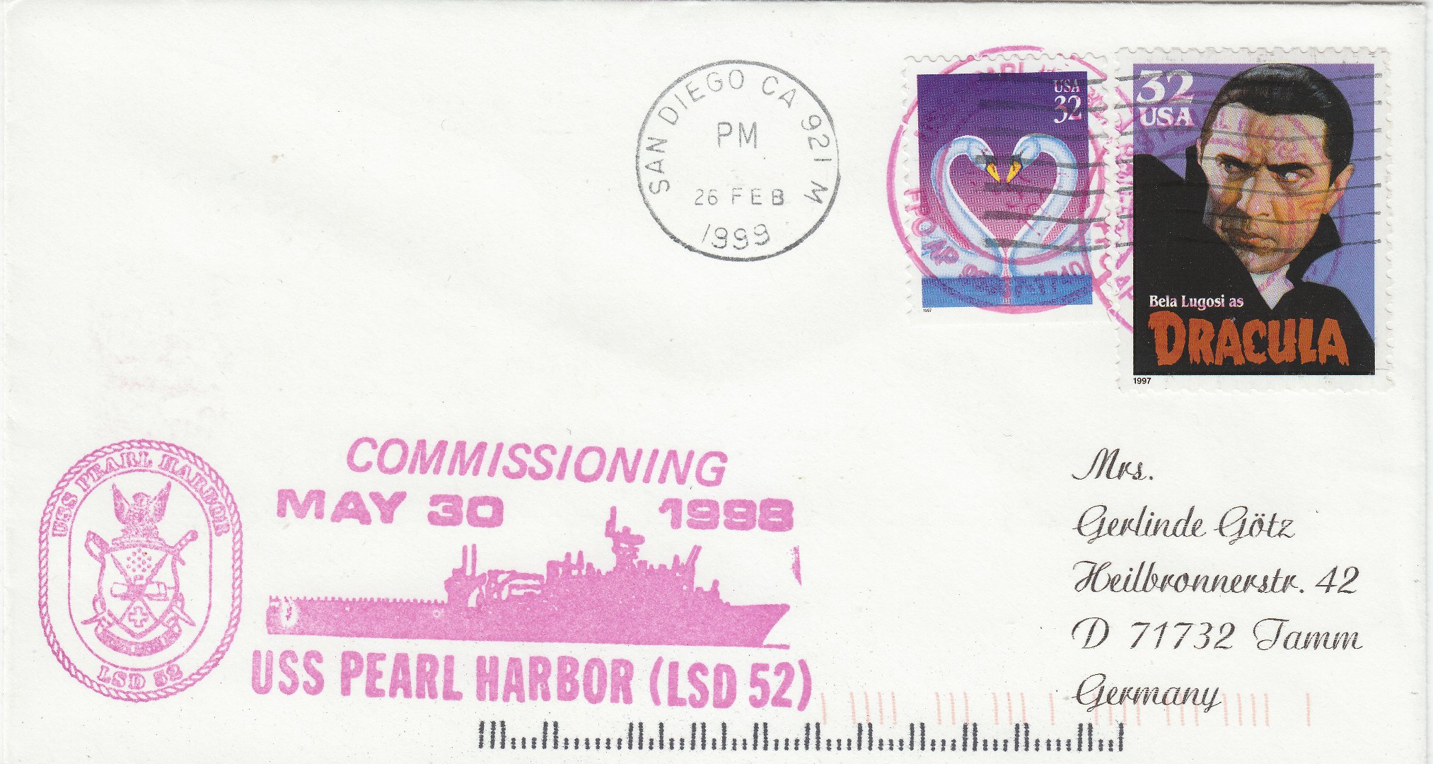 Die Indienststellung der USS PEARL HARBOR (LSD-52) erfolgte am 30.05.1998, worauf der Cachetstempel sowie die Entwertungsstempel in Rosalila bei diesen beiden Belegen hinweisen: