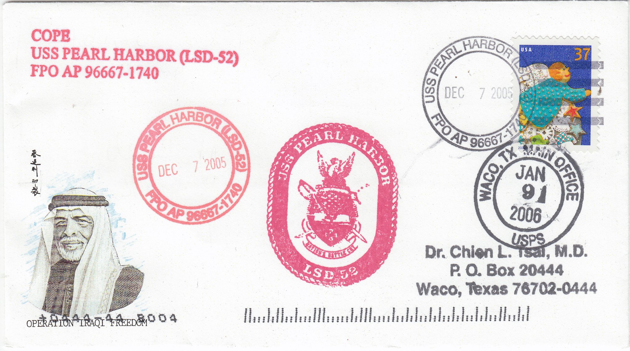 Dieser Beleg wurde am 07.12.2005 während der OPERATION IRAQI FREEDOM an Bord aufgegeben und kam am 09.01.2006 am Bestimmungsort Waco in Texas an: