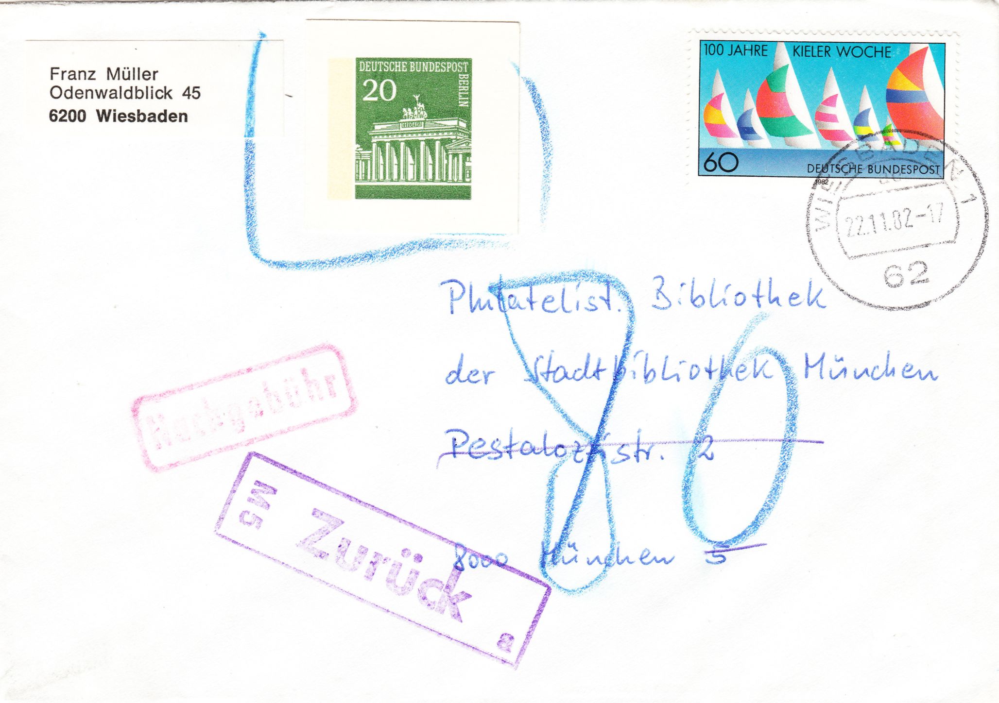 Der Empfänger verweigerte die Annahme und der Brief ging an den Absender "Zurück", worauf ein violetter Stempel des Postamtes München "M 5" hinweist.