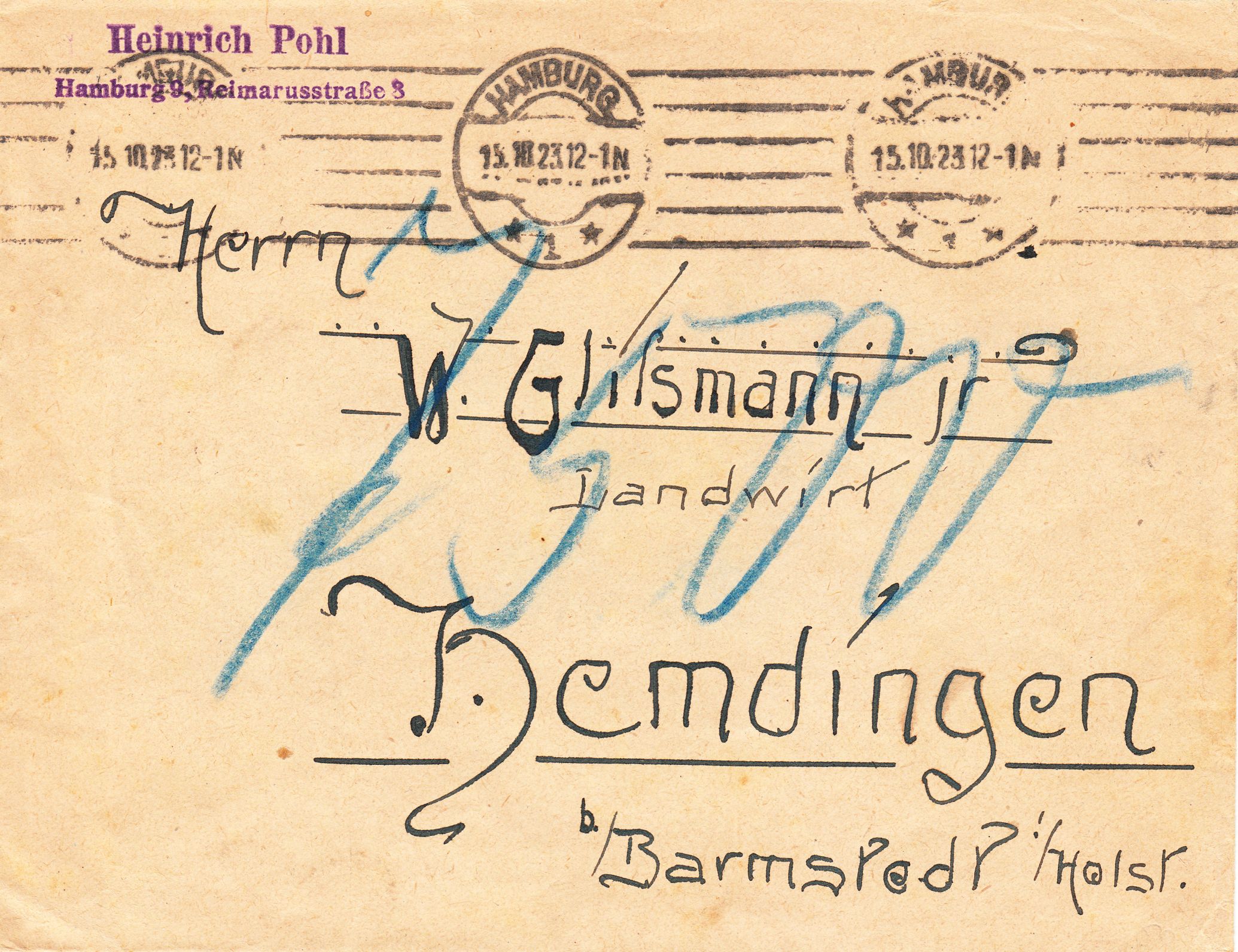 Die Sendungsart "Drucksache" wurde nicht anerkannt und daher durchgestrichen. Somit war aus der Portostufe zu 7 Pfennig für eine Drucksache die Portostufe 20 Pfennig für einen Brief im Fernverkehr geworden.