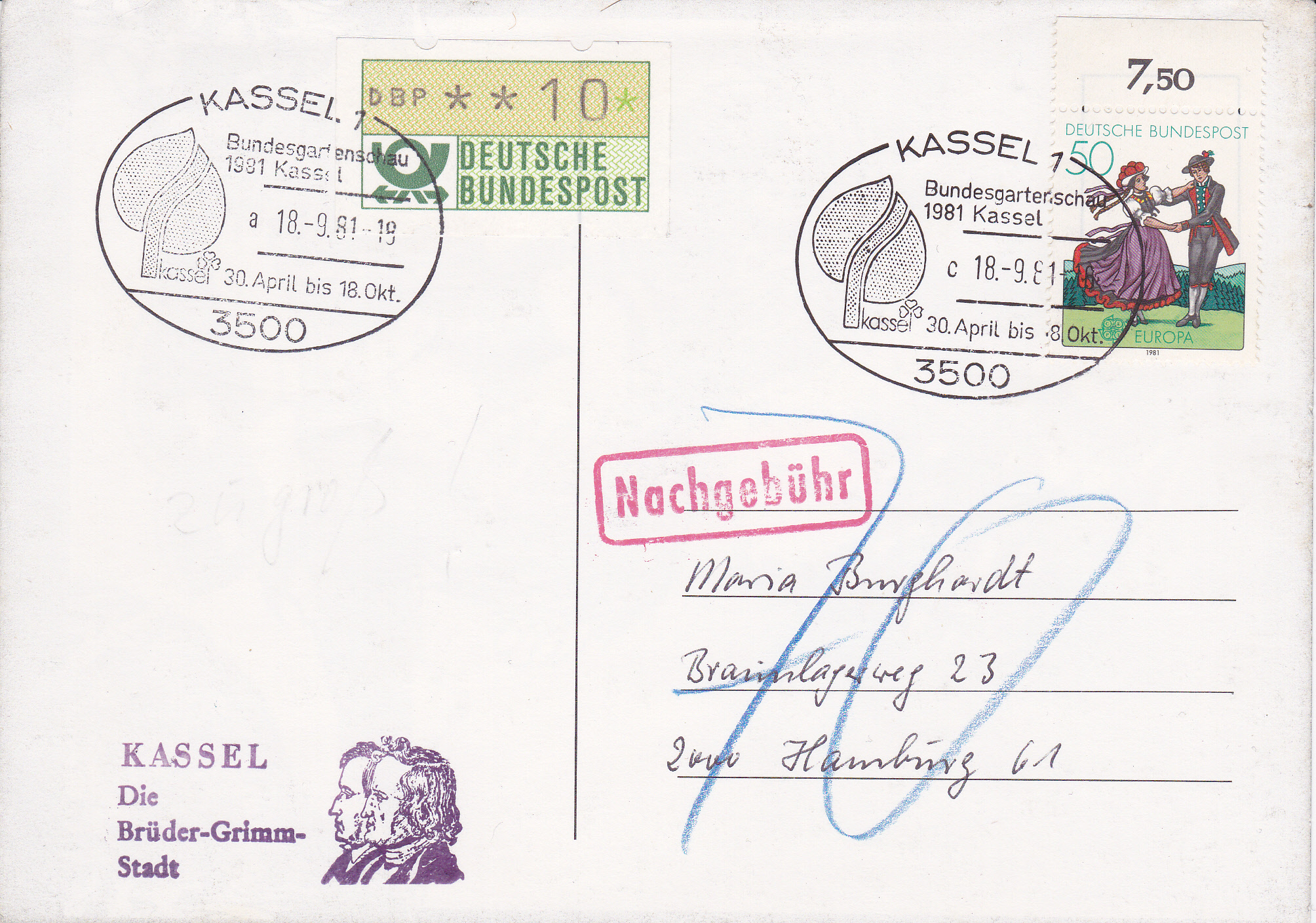 Diese Postkarte wurde mit 60Pf frankiert, um den Sonderstempel zur Bundesgartenschau zu dokumentieren. Das normale Postkartenporto betrug zum Zeitpunkt des Versandes 50Pf. Eine Postkarte durfte bis zum 31.8.1997 nur eine maximale Größe von 162 x 114 mm haben. Diese Karte ist aber 170 x 120 mm. Sie hatte also Übergröße. Deshalb wurde eine Nachgebühr fällig. Bei der Bestimmung der Nachgebühr komme ich aber nicht weiter. Die Einziehungsgebühr betrug 50Pf. Also müssen 20Pf am Porto gefehlt haben. Bei Briefen, die kein Standardformat hatten, wurde stets das Porto für die nächste Portostufe berechnet. Was war nun die Berechnungsgrundlage für diese Postkarte? Offenbar wurde diese Karte (Rückseite gedruckt) als Briefdrucksache eingestuft. Diese kostetete in der zweiten Gewichtsstufe 80Pf, 60Pf waren frankiert, es hätten also 20Pf gefehlt. Dies ergäbe mit den 50Pf Einziehungsgebühr die eingezogenen 70Pf. Oder hat jemand eine andere Erklärung?