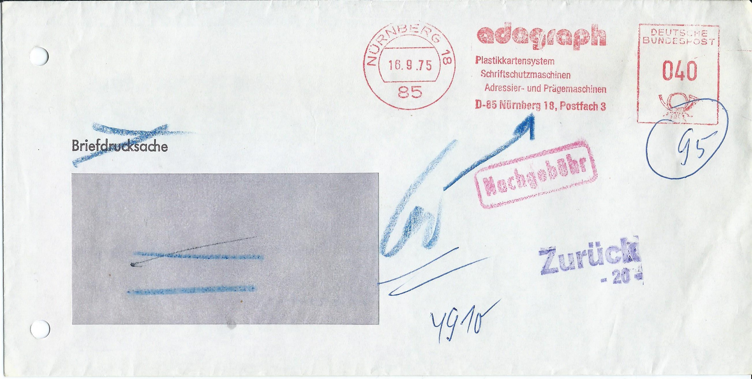 Der 2. Freistempel-Beleg gibt mir auch wieder Rätsel auf: Ursprünglich als Briefdrucksache zu 40 Pf frankiert durch die Firma edagraph Nürnberg am 16.9.75 und dann mit 60 Pf Nachporto versehen. Zu allem überfluss auch noch nach verweigerter Annahme des Empfängers zurück gesandt, aber auch hier die Fragezeichen im Gesicht, wie sich der Betrag von 60 Pf zusammen setzt und warum überhaupt der Vermerk Briefdrucksache durchgestrichen ist.