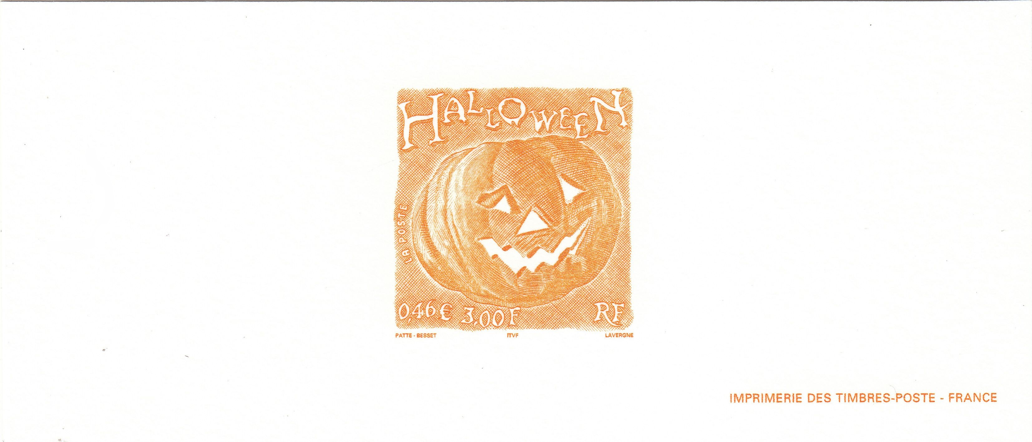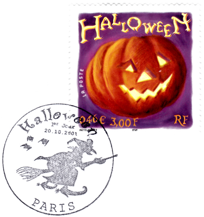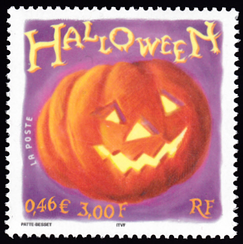 Hier ist sie nun in voller Größe, eine postfrische Marke aus Frankreich aus dem Jahre 2001 (MiNr 3567) mit dem Kürbiskopf zu Halloween.