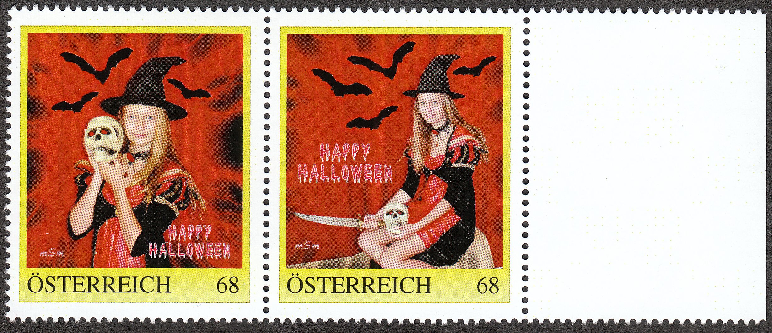 Hier als Beispiel ein Zusammendruck von zwei personalisierten Marken der Wertstufe 68 €-Cents mit Halloween-Motiven: