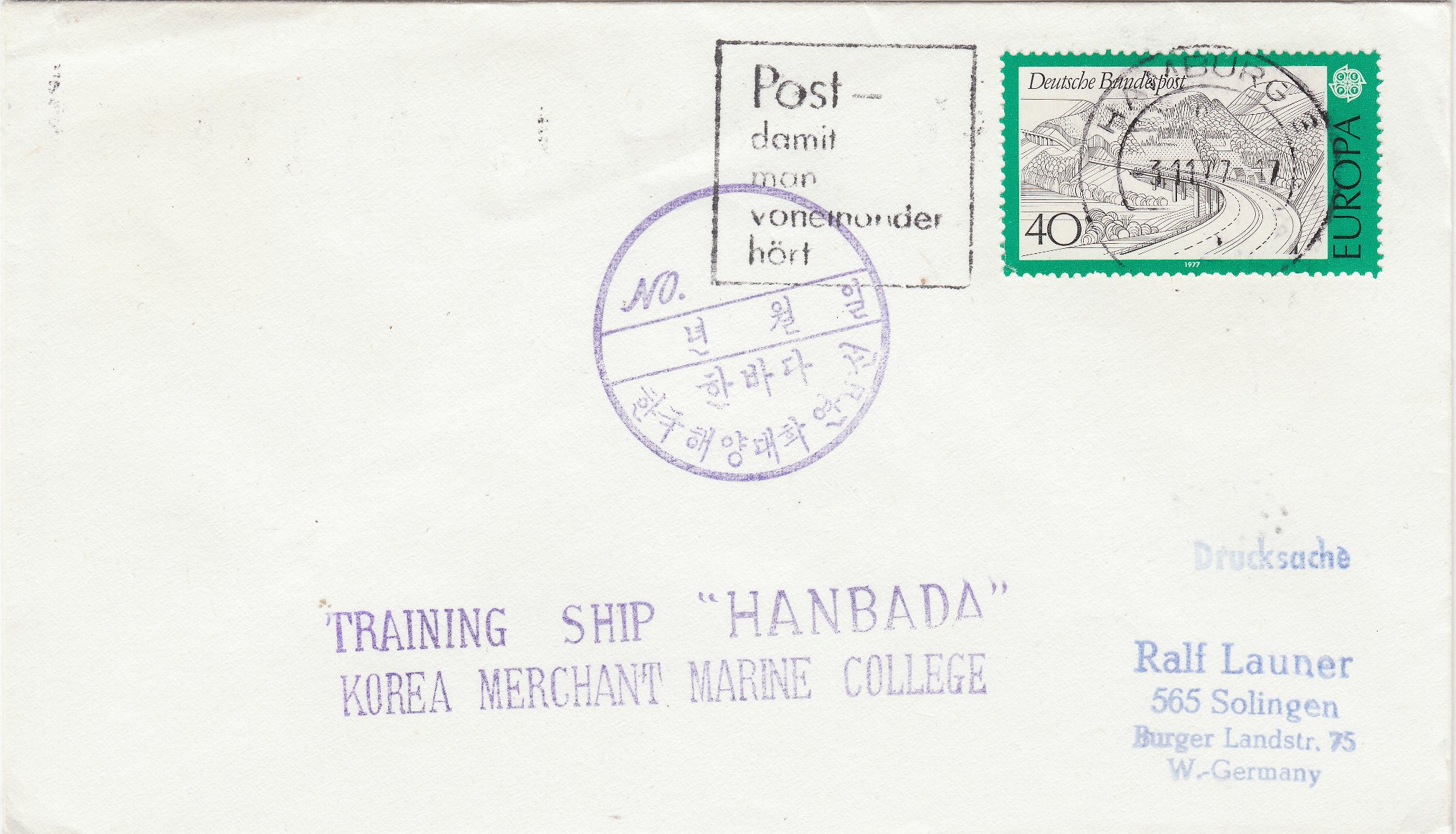 Das Trainings-Schiff = TS HANBADA vom südkoreanischen College der Handelsmarine stattete 1977 dem Hamburger Hafen einen Besuch ab, was per diesem Beleg dokumentiert wurde: