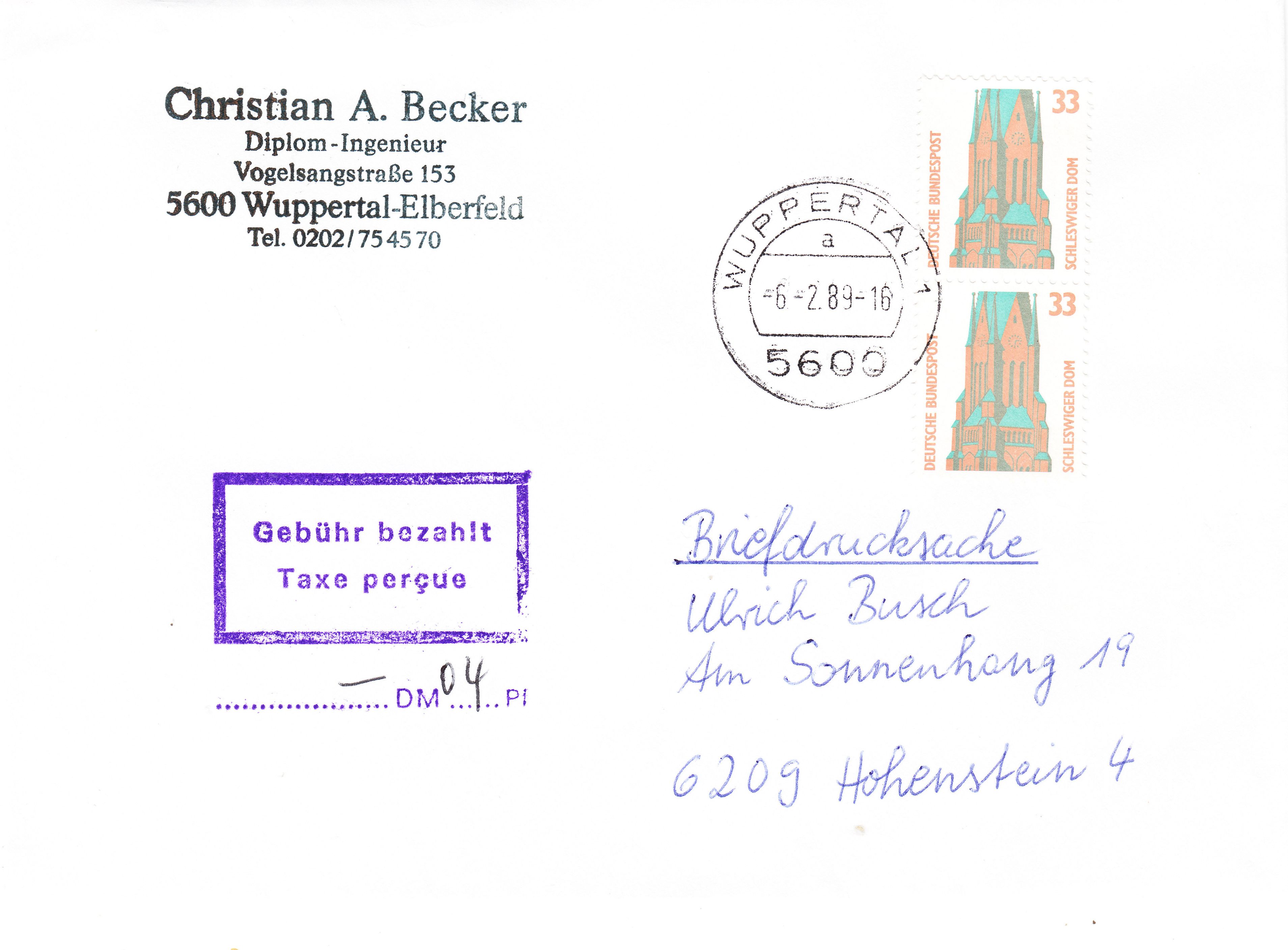 Hier ein solches Beispiel aus Wuppertal, wo zwei Exemplare der Wertstufe zu 33 Pf auf einer Standardbriefdrucksache der Portostufe zu 70 Pf verklebt wurden. Das fehende Porto in Höhe von 4 Pf wurde dann bei der Einlieferung dieses Beleges am Postschalter bar bezahlt: