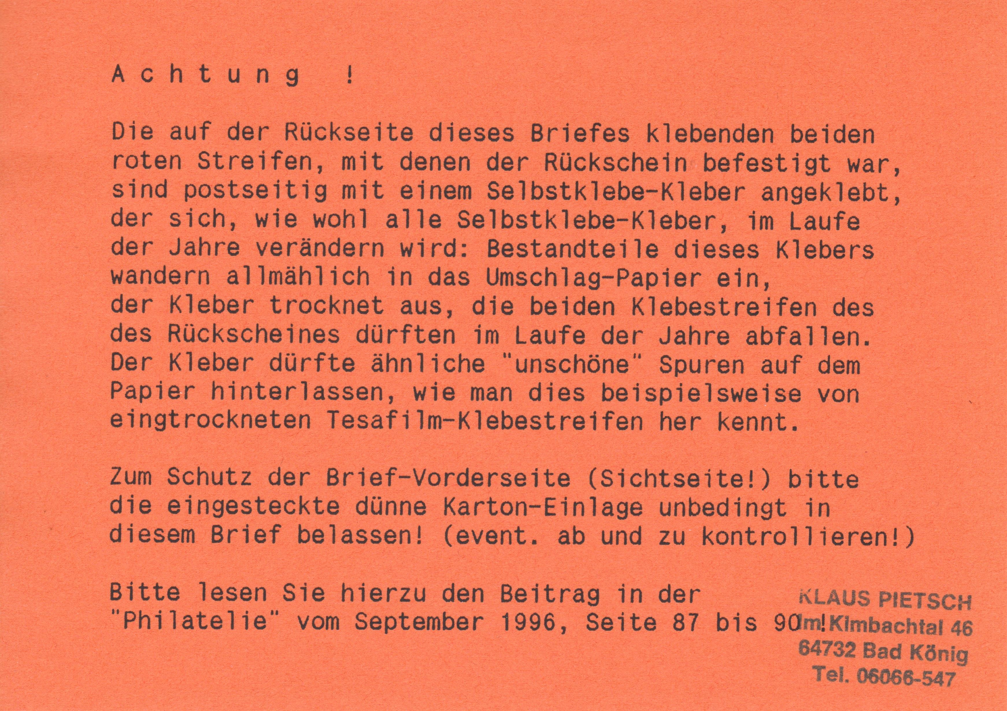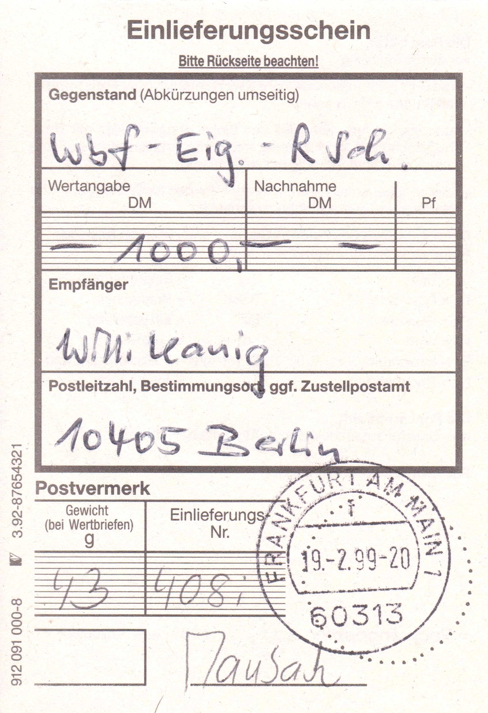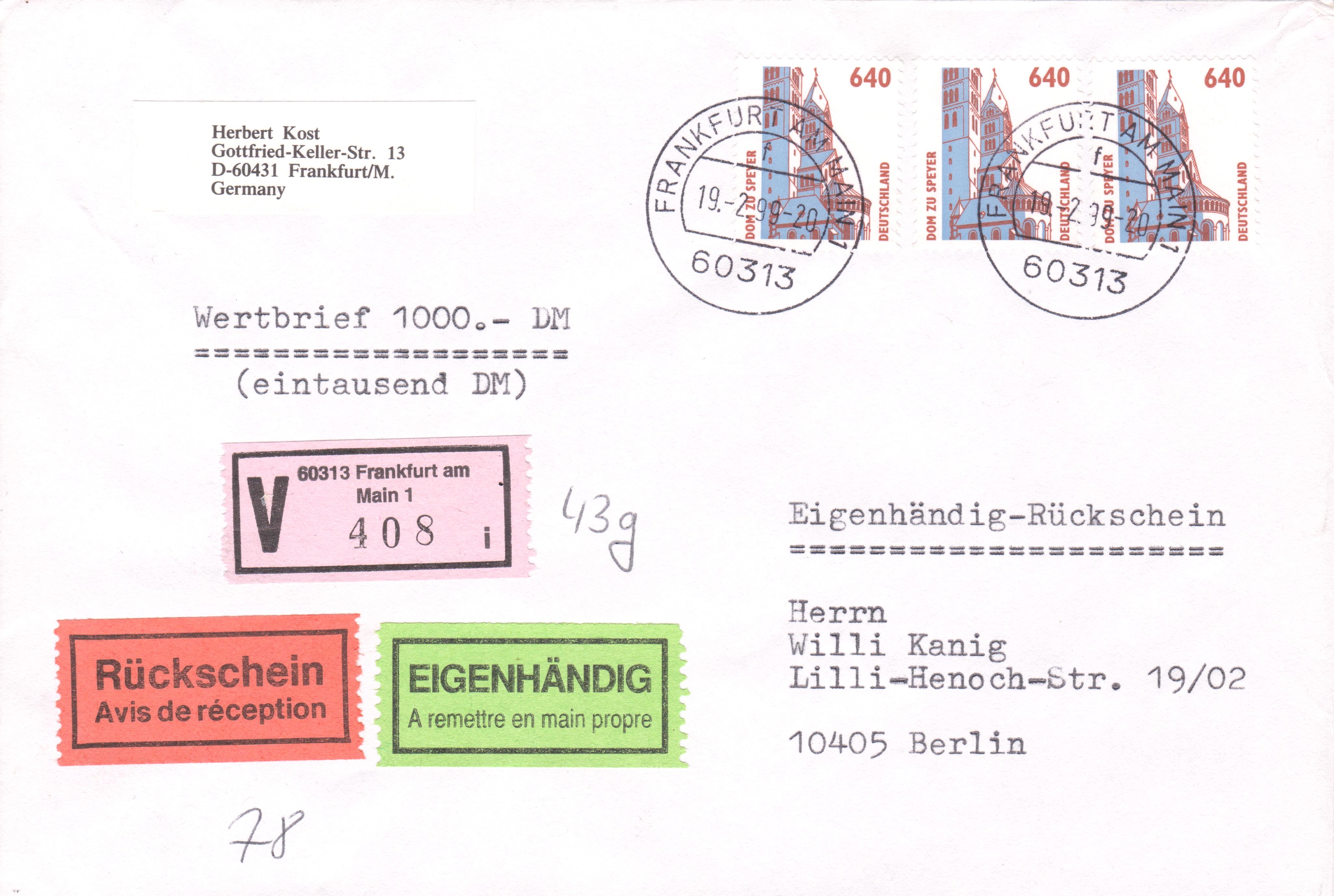 Mehrfachfrankatur 3 x 640 Pf am 19.02.1999 portogerecht auf Brief der zweiten Gewichtsstufe mit Wertangabe 1000 €, eigenhändig sowie mit Rückschein: