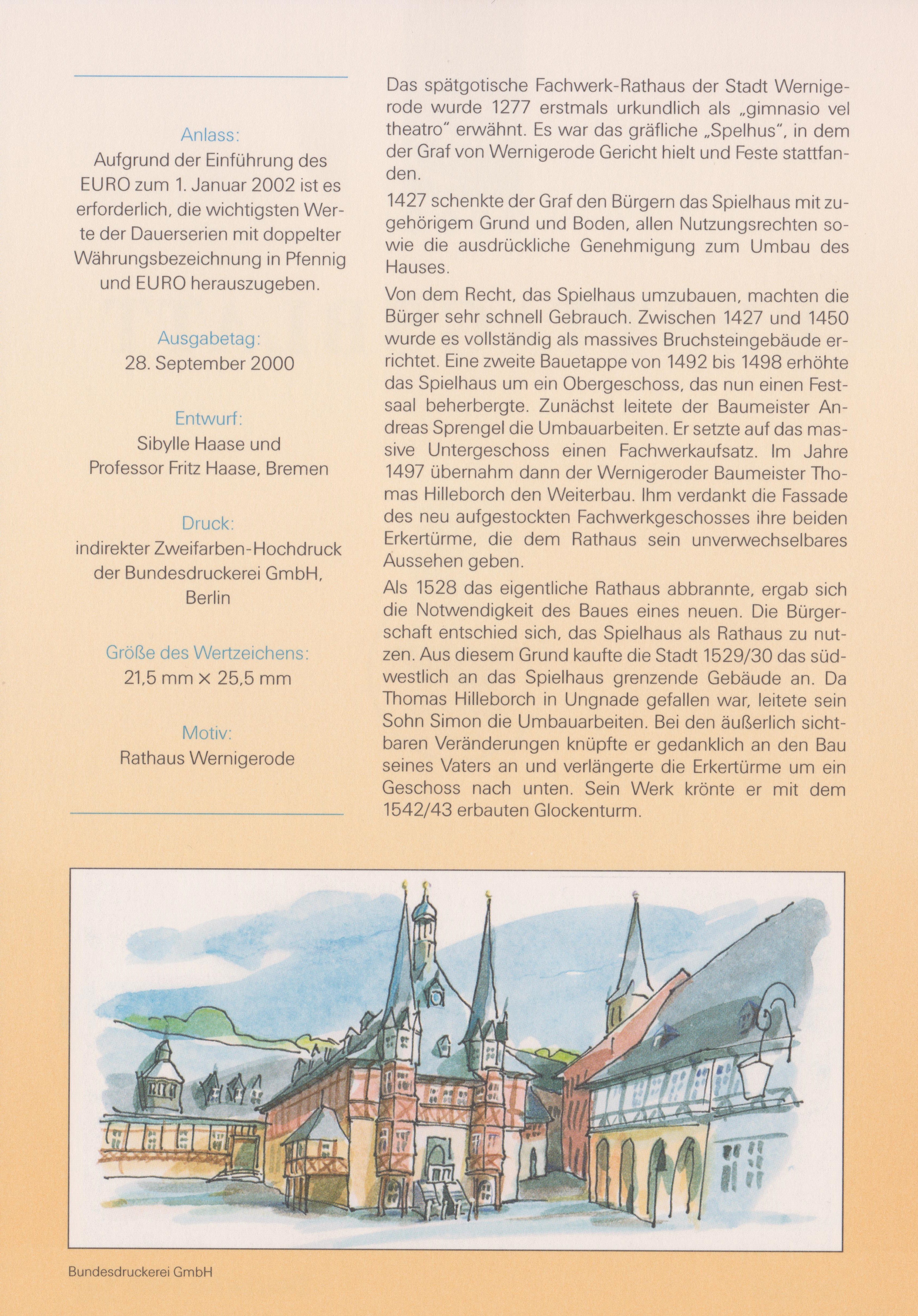 Am 28.9.2000 wurde die Marke zu 10Pf/0,05 € verausgabt, sie zeigt als Motiv das Rathaus in Wernigerode.