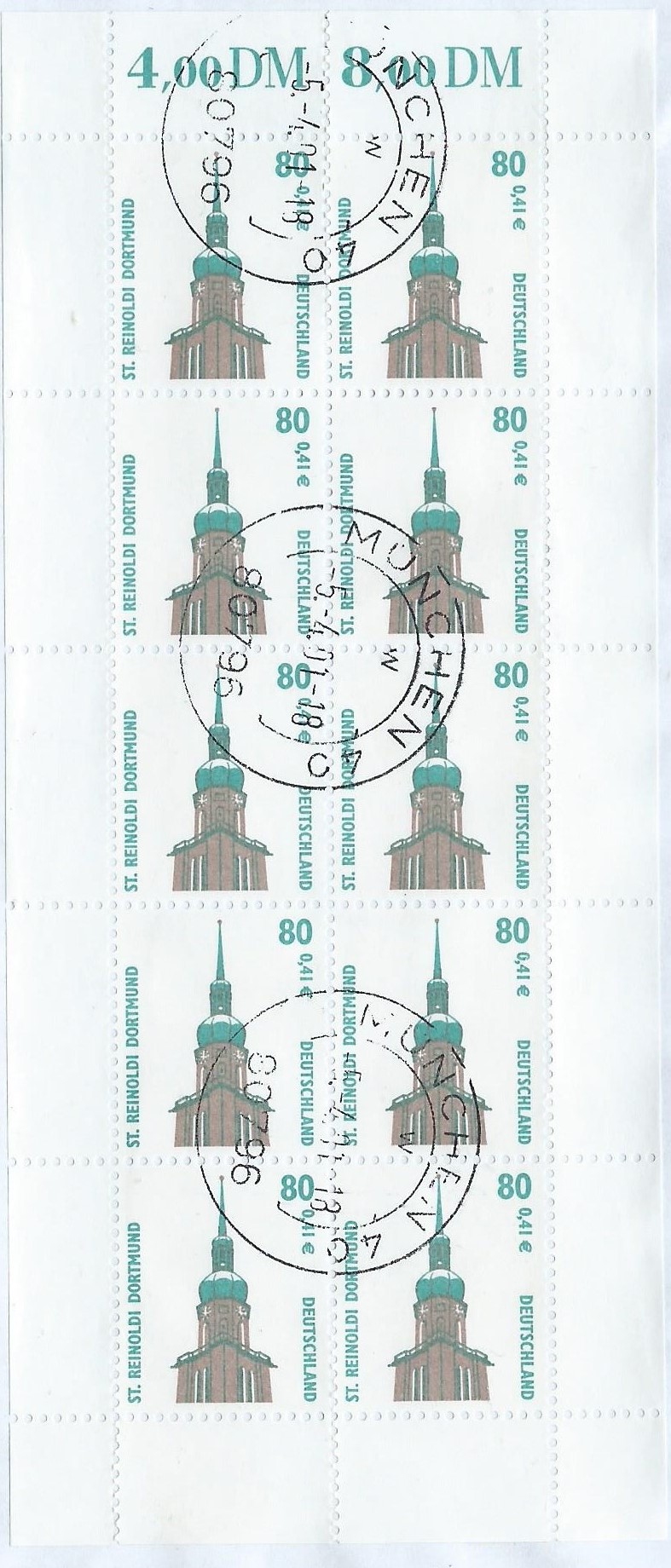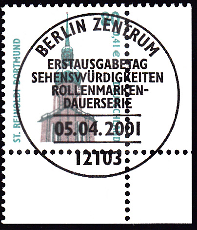 Am 5.4.2001 wurde die Marke zu 80Pf/0,41 € verausgabt, sie zeigt als Motiv die Kirche St. Reinoldi in Dortmund. Hier eine Marke vom linken unteren Bogenrand: