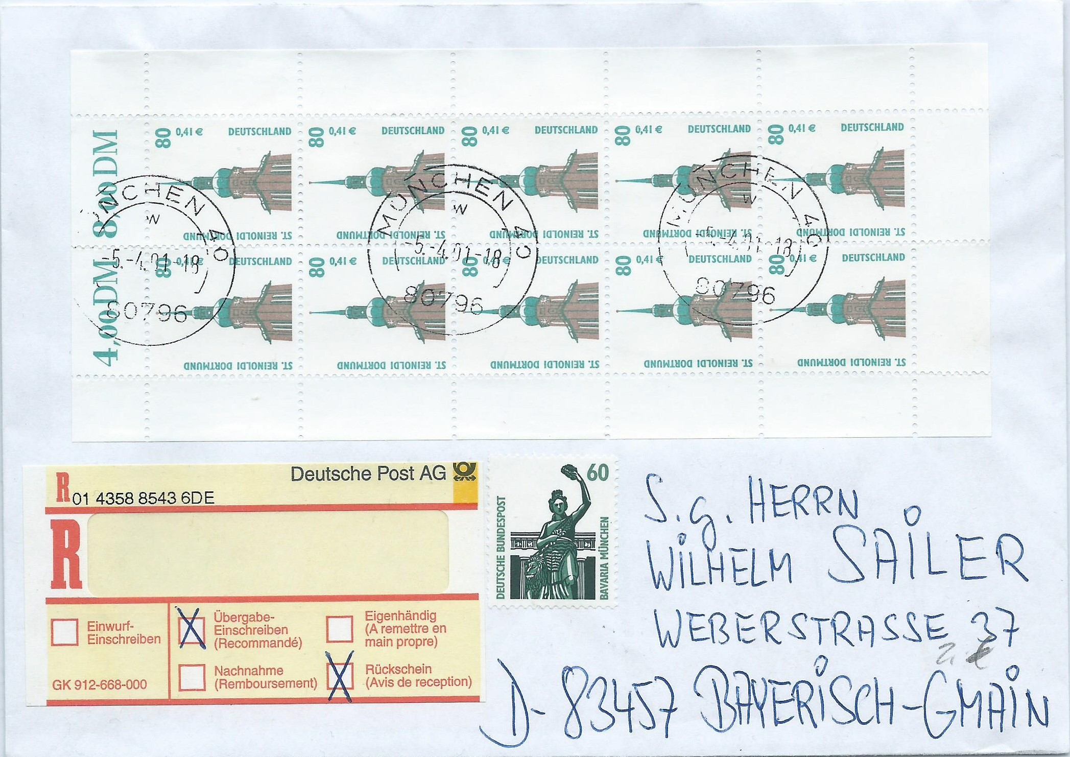 hier kann ich einen Einschreibbeleg mit Rückschein als Mischfrankatur zeigen: Das Porto setzt sich wie folgt zusammen: Brief 110 Pf, Einschreiben 400 Pf und Rückschein 350 Pf, zusammen 860 Pf. Die Gebühr wurde hier mit einem 10-er-Bogen der Doppelnominale 80 Pf/ 0,41 € (800 Pf) und einer Einzelmarke zu 60 Pf verklebt. Der 10-er-Bogen wurde am 5.4.01 in München gestempelt, die Einzelmarke wurde beim Stempeln vergessen. Der Beleg kommt in meine Sammlung „Einheiten“, wer hat schon einen ganzen 10-er-Bogen aus dem Bedarf im Bestand?