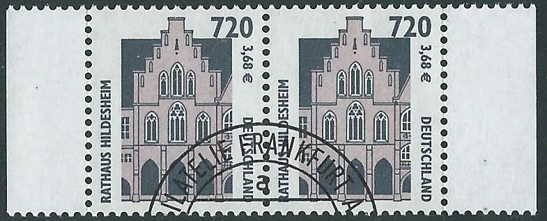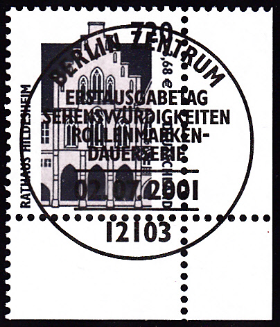 Am 2.7.2001 wurde die Marke zu 720Pf/3,68 € € verausgabt, sie zeigt als Motiv das Rathaus in Hildesheim. Hier eine Marke vom linken unteren Bogenrand: