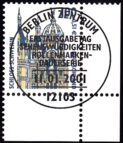 Am 11.1.2001 wurde die Marke zu 100Pf/0,51 € verausgabt, sie zeigt als Motiv das Schloss Schwerin. Hier eine Marke vom linken unteren Bogenrand: