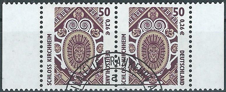 Am 5.9.2001 wurde die Marke zu 50Pf/0,26 € verausgabt, sie zeigt als Motiv die Kassettendecke im Zedernsaal des Fuggerschlosses in Kirchheim (Schwaben) . Hier eine Marke vom linken unteren Bogenrand: