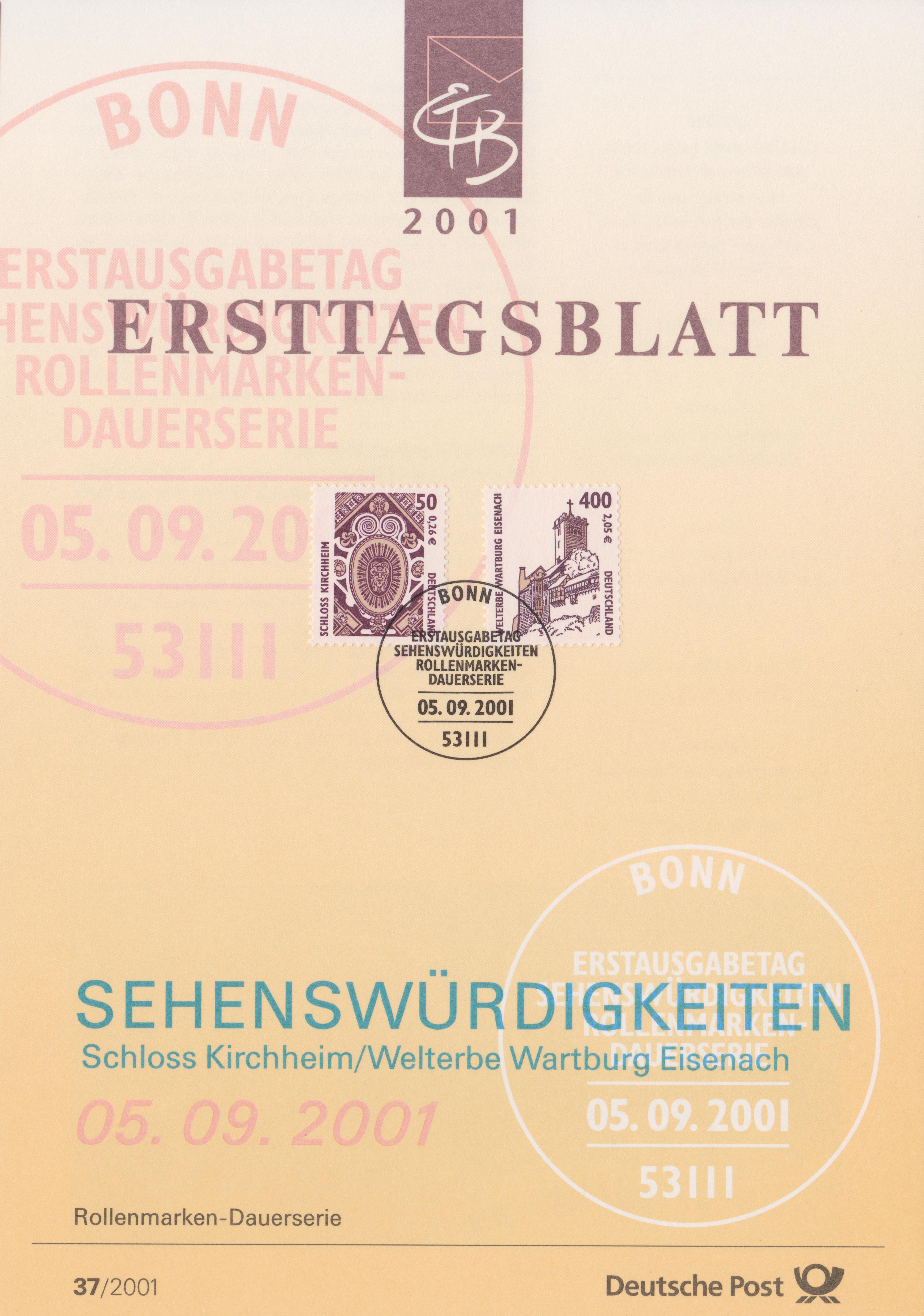 Bogenecke links oben, gestempelt POSTPHILATELIE FRANKFURT AM MAIN am 05.09.2001 (= Erstausgabetag):